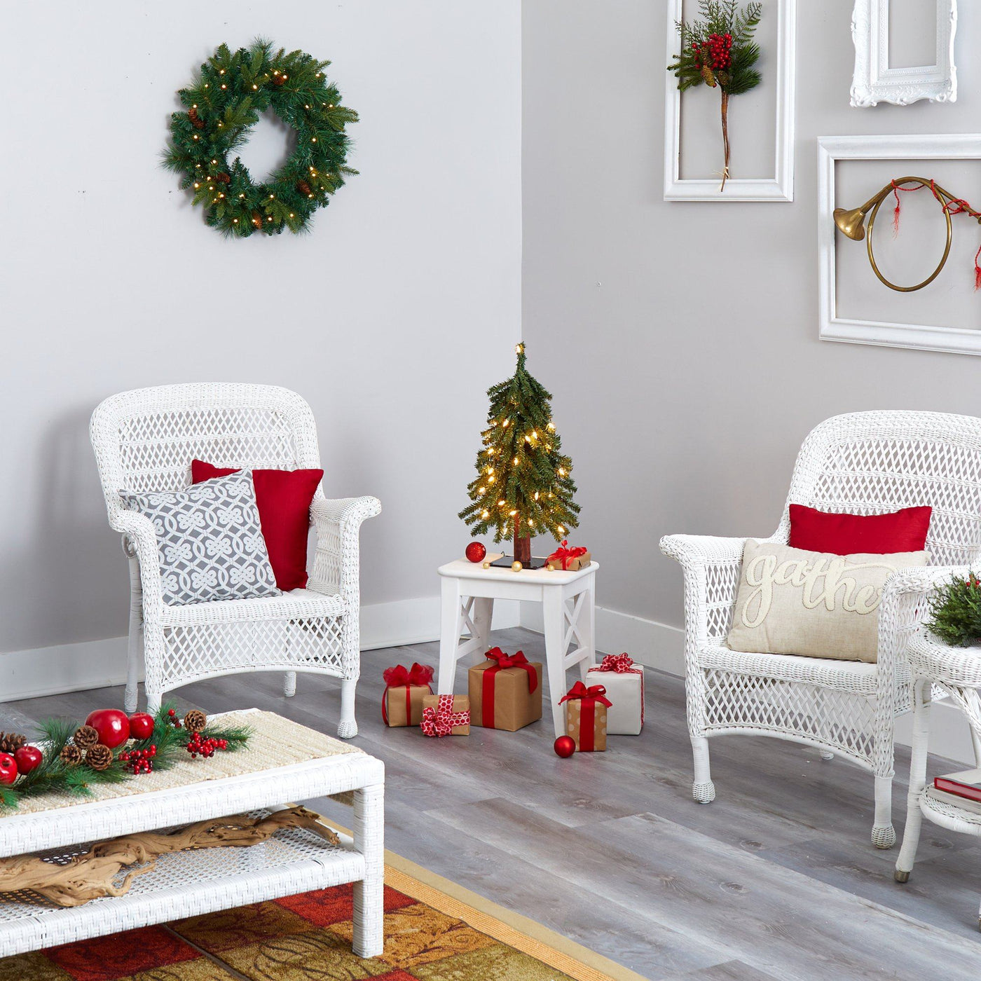 Spread holiday cheer to any tabletop with this artificial Pine Berry Christmas Tree. Lush, PVC needles are lightly dusted with snow and accented throughout with berries that look incredibly lifelike. This mini faux tree comes pre-lit with 35 lights and 50 bendable branches to save you time and money. Standing 2' from a burlap base for a rustic v...