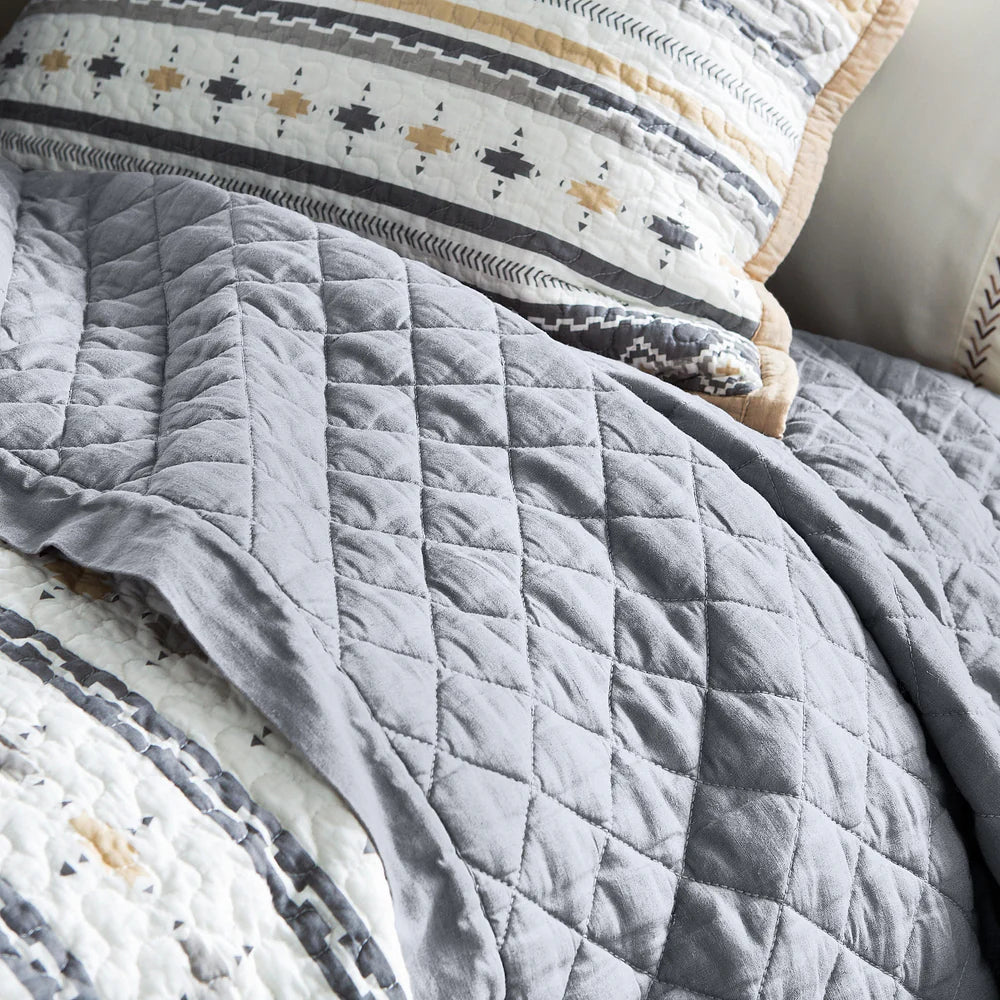 • A soft, modern take on Southwestern style, Desert Sage presents Aztec kilim in a refreshing palette of grays and tans. Stipple quilting softens the bold geometric patterns, which are corralled in a tan flange border. Add style as well as softness with our Linen Cotton Diamond Quilt, or texture through our velvet, woven leather, and washed linen pillows and shams. Desert Sage also features a coordinating canister set.