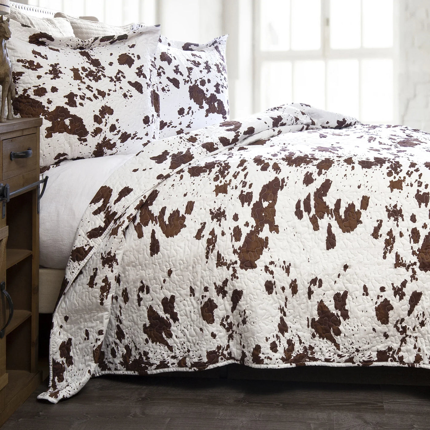 Introducing our Cowhide Quilt Bedding Set, a chic and timeless ensemble that brings a touch of rustic elegance to your bedroom. In classic brown and white, this quilt captures the natural charm and sophistication of cowhide, creating a stylish and cozy retreat