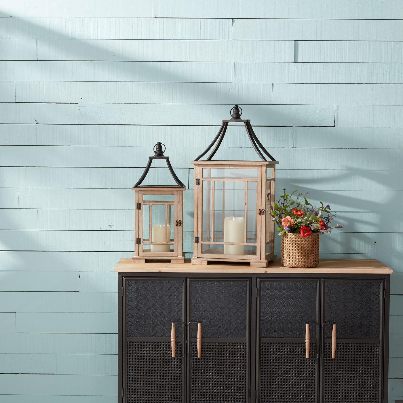 A compelling blend of historical beauty and modern cottage charm, this handsome square lantern is softened by an aged grey finish and a glass-free, openwork design. Ideal for filling with dried botanicals or live plants like moss or ivy, it's roomy and features pane-like designs on all four sides for threading branches or florals through. A ring...
