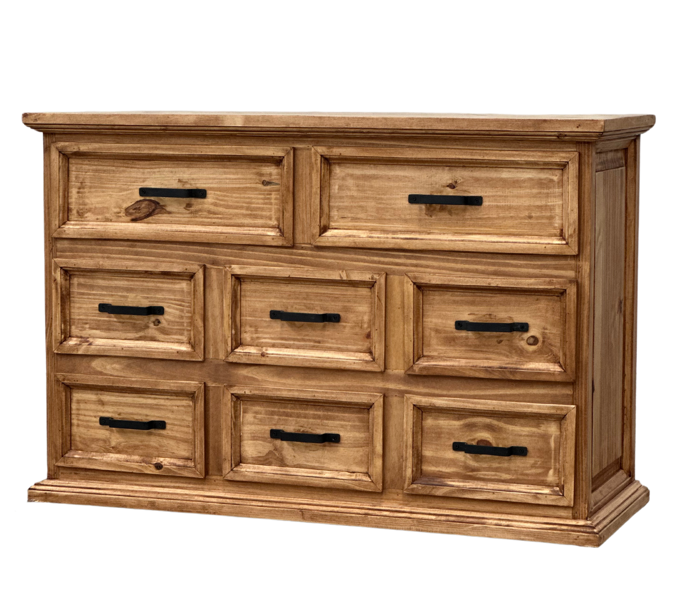 Introducing the Small Sacristia Rustic Dresser, a traditional Mexican-inspired piece crafted from solid pine wood. This charming dresser features a practical design with two large drawers on top and six smaller drawers below, offering ample storage space in a compact 52" wide frame.