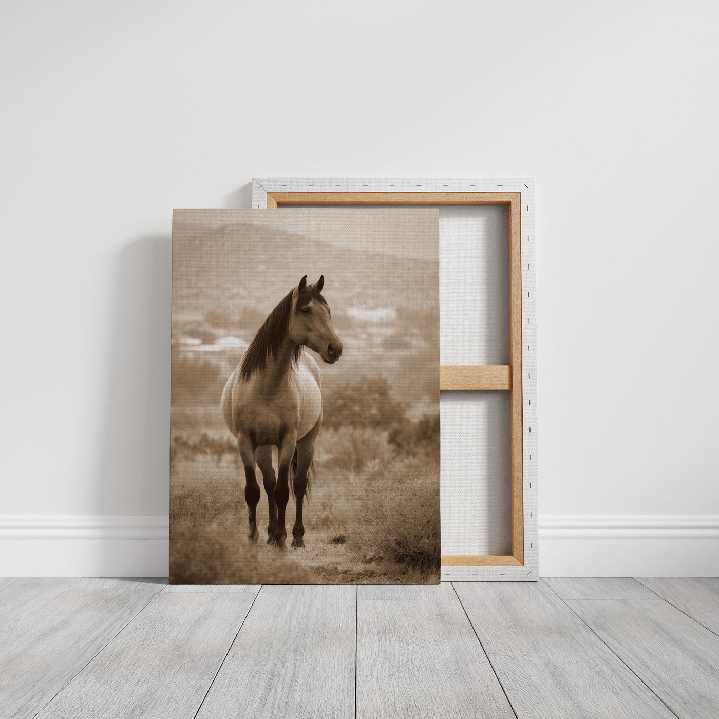 In the golden hour light, a magnificent paint horse stands sentinel in the wild grassland, embodying everything we love about these noble creatures—their quiet strength, their untamed spirit, and their profound connection to the open range. This is freedom captured in a single frame. Part of our Wild Spirits collection, this powerful black and w...