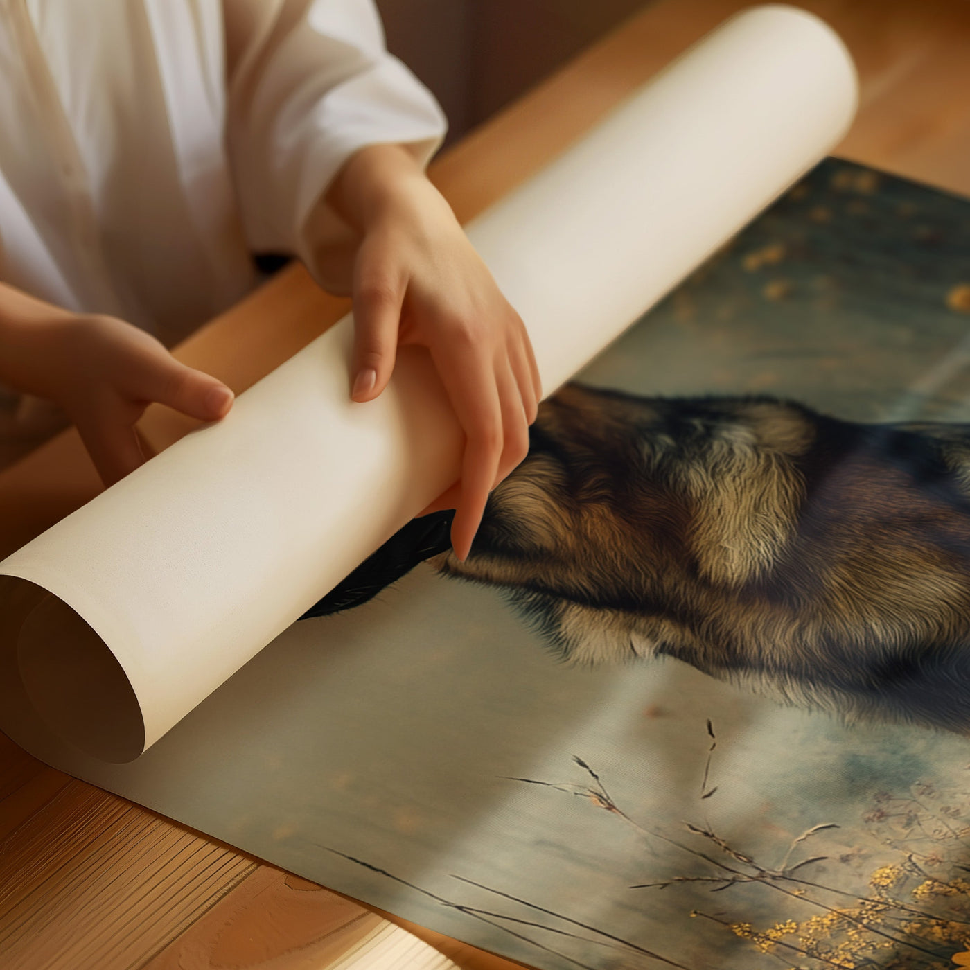 At the old pasture gate, two gentle souls share the kind of quiet conversation that speaks without words. There's poetry in this peaceful moment—the weathered fence bearing witness to countless seasons, the soft afternoon light filtering through ancient trees, the timeless bond between companions. Part of our Country Roads collection, this...