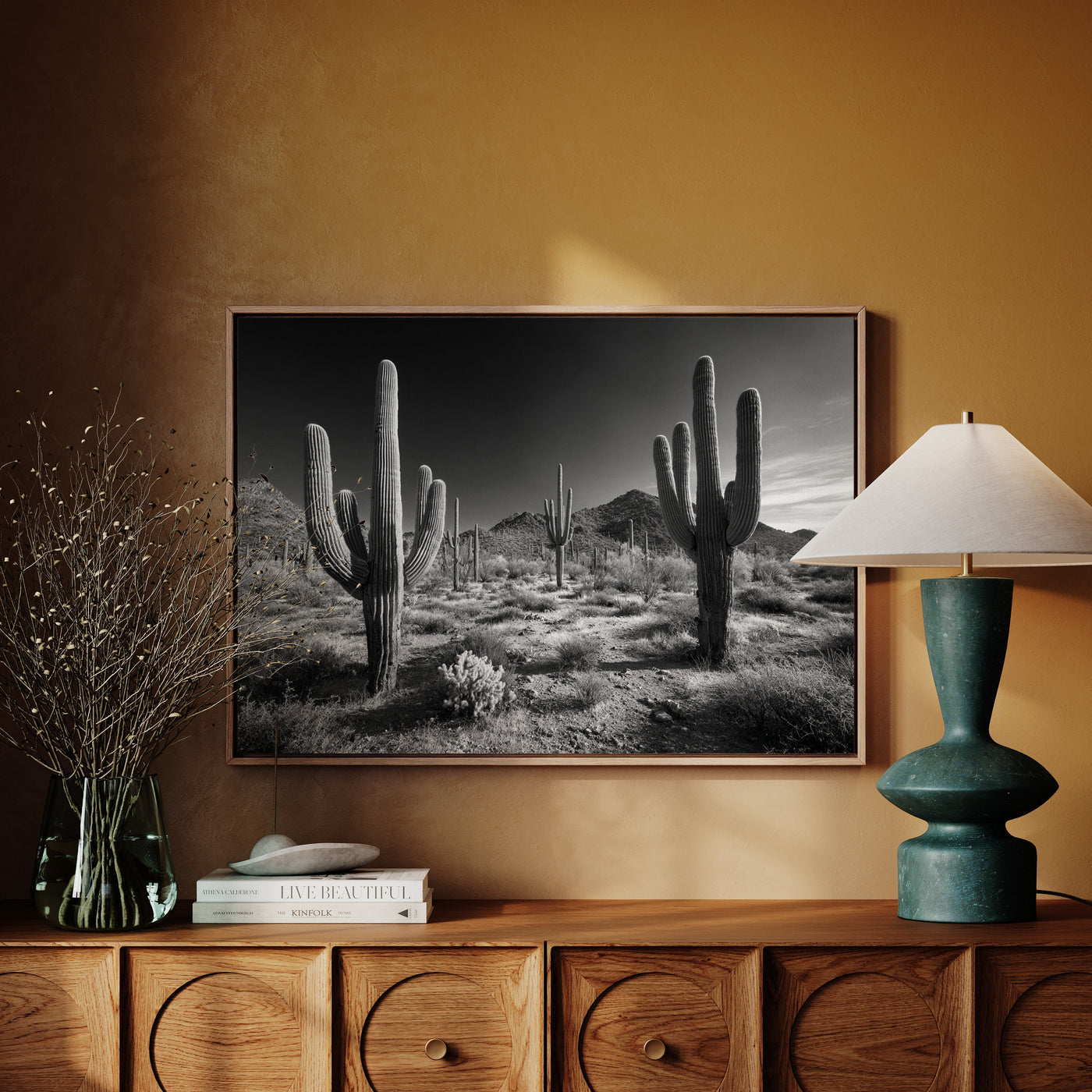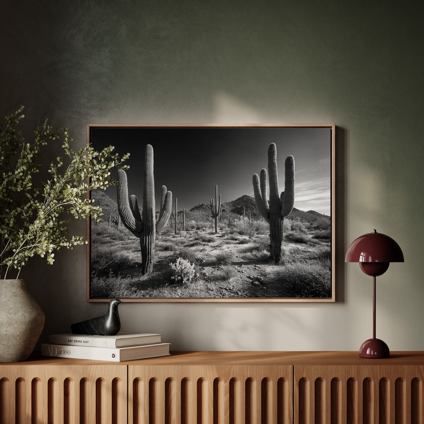 Across the vast plains where thunder once echoed in hoofbeats, this magnificent skull stands as a monument to untamed spirit. Each weathered curve tells stories of strength, endurance, and the wild heart of the American frontier. Captured in striking monochrome, this piece honors the majestic buffalo that once ruled the Great Plains. The dramati...