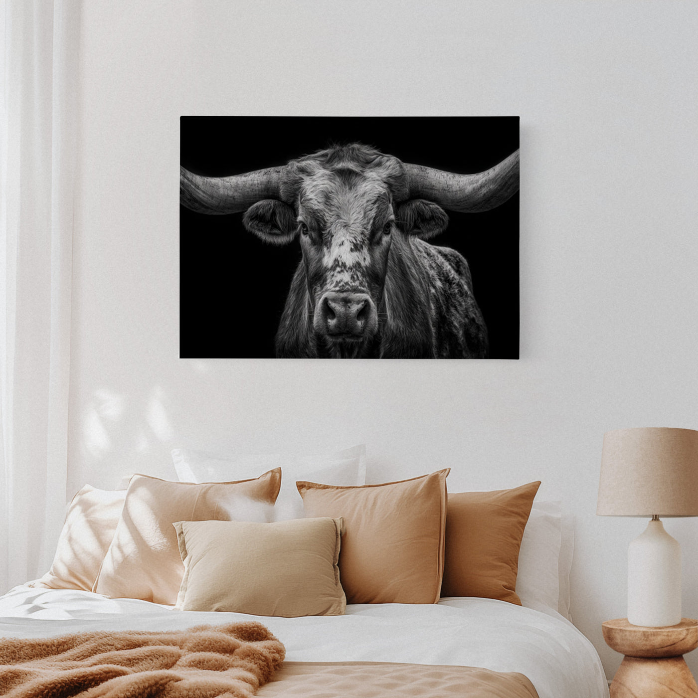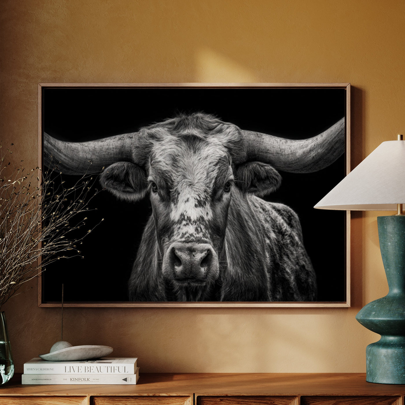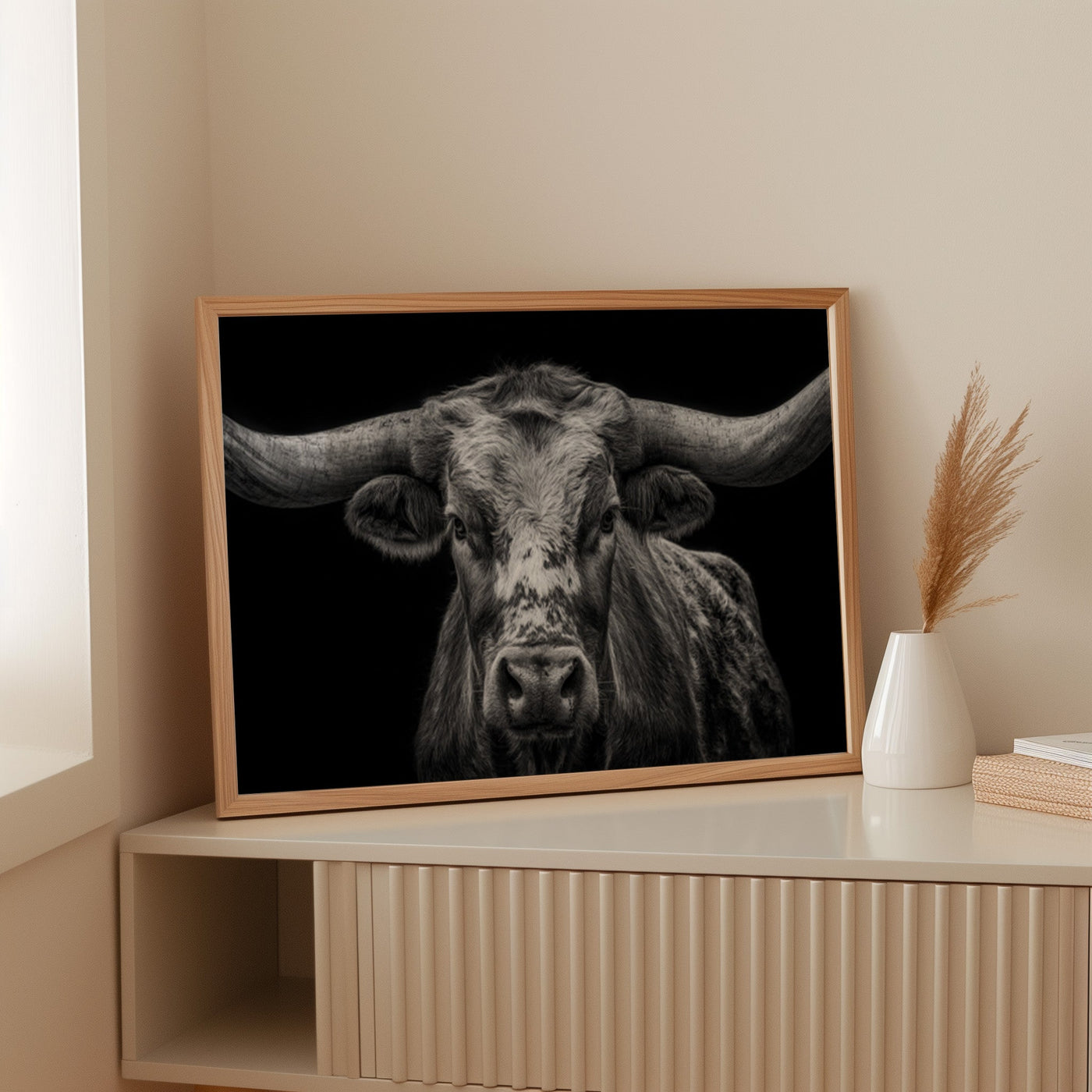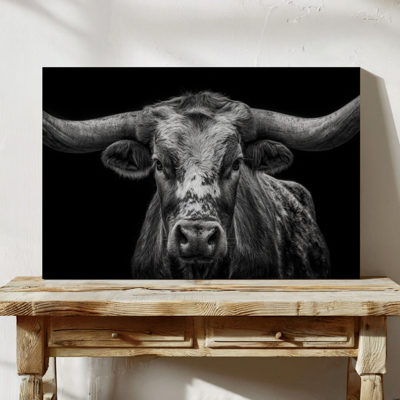 Across the vast plains where thunder once echoed in hoofbeats, this magnificent skull stands as a monument to untamed spirit. Each weathered curve tells stories of strength, endurance, and the wild heart of the American frontier. Captured in striking monochrome, this piece honors the majestic buffalo that once ruled the Great Plains. The dramati...