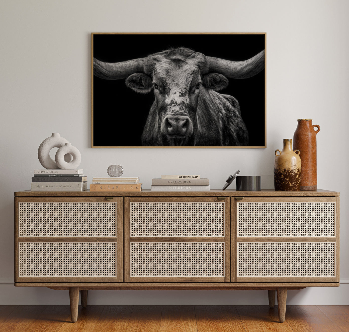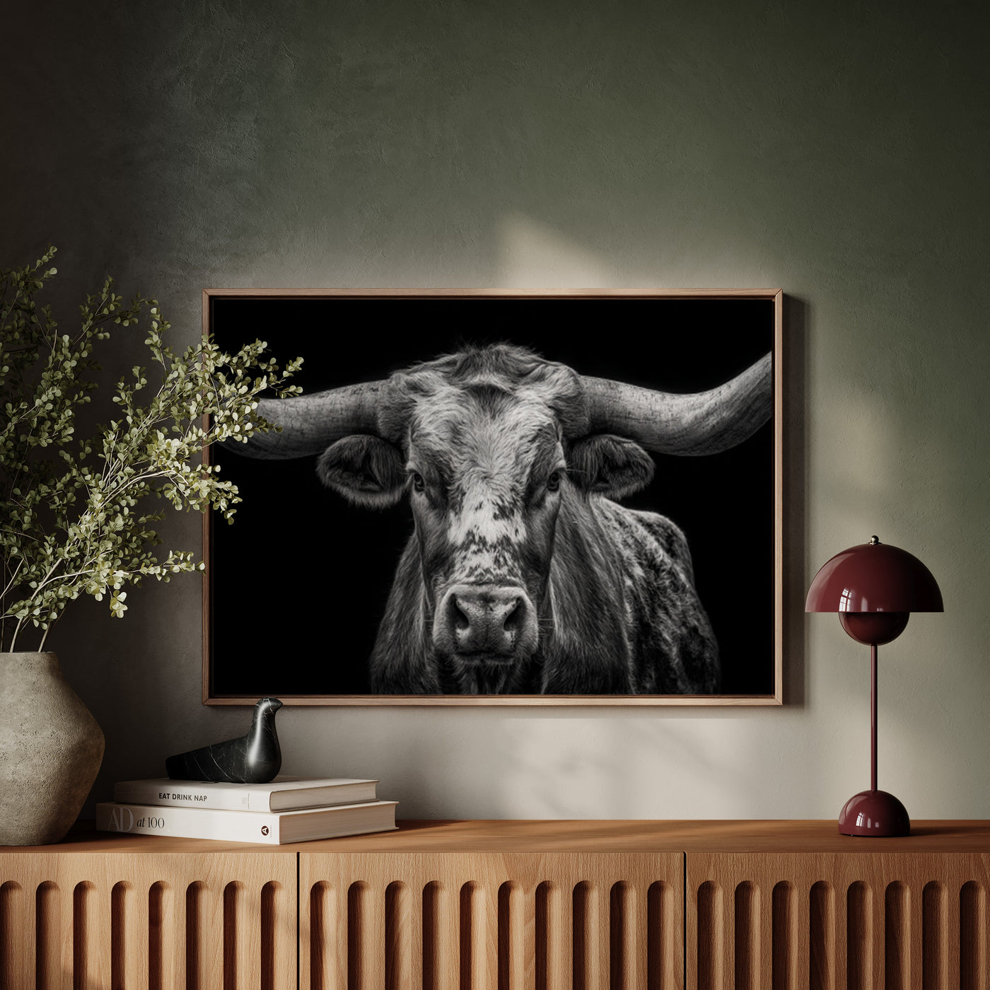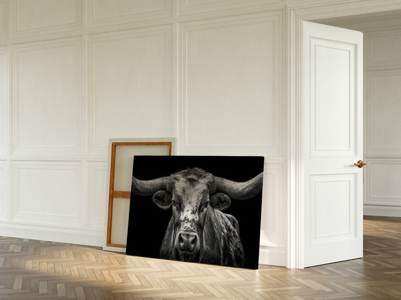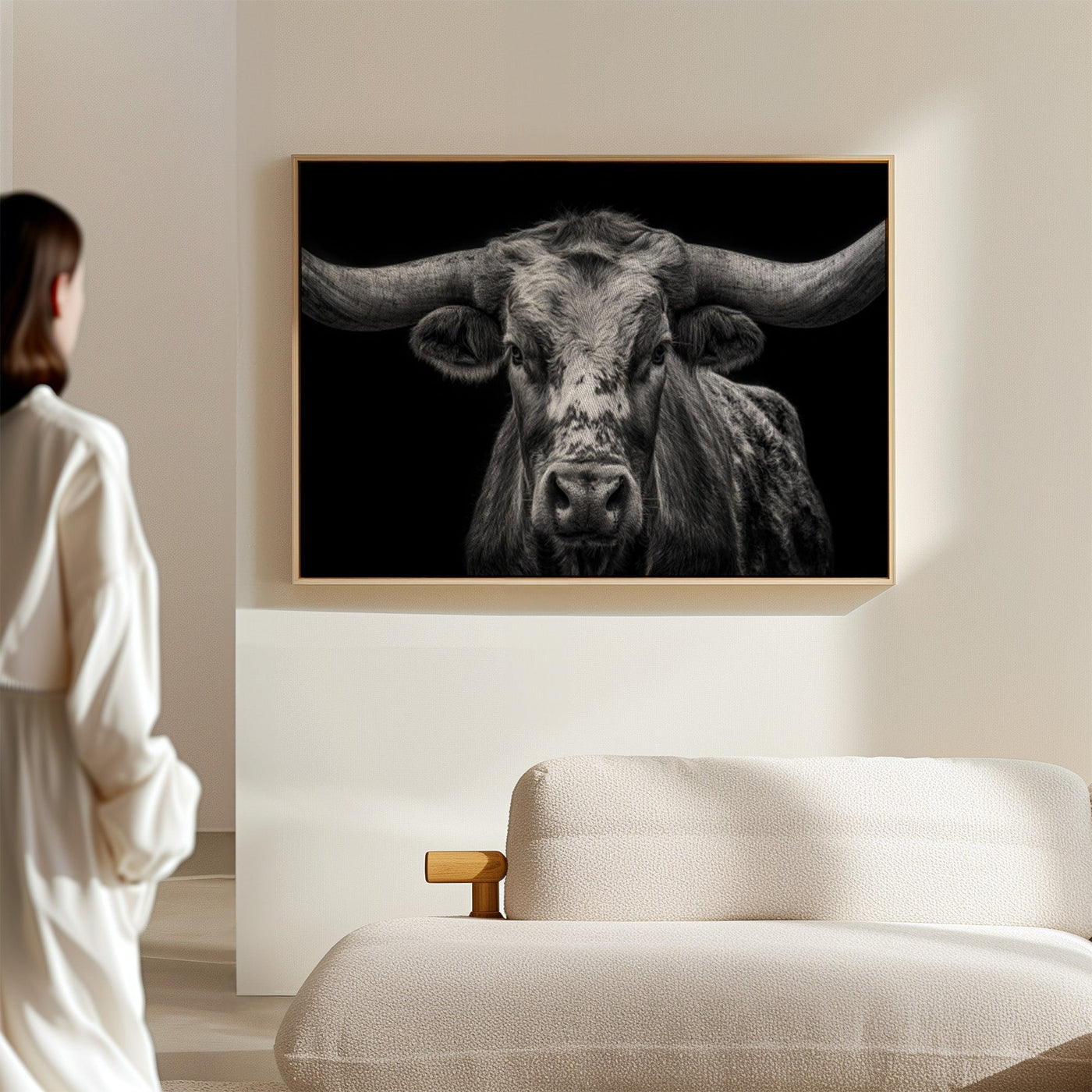 Across the vast plains where thunder once echoed in hoofbeats, this magnificent skull stands as a monument to untamed spirit. Each weathered curve tells stories of strength, endurance, and the wild heart of the American frontier. Captured in striking monochrome, this piece honors the majestic buffalo that once ruled the Great Plains. The dramati...