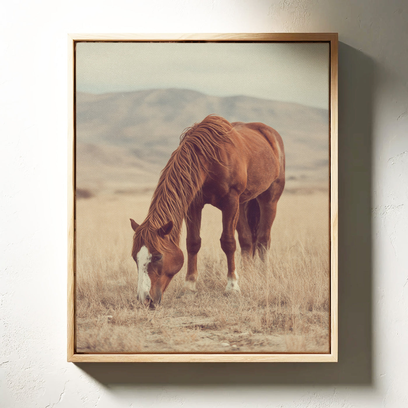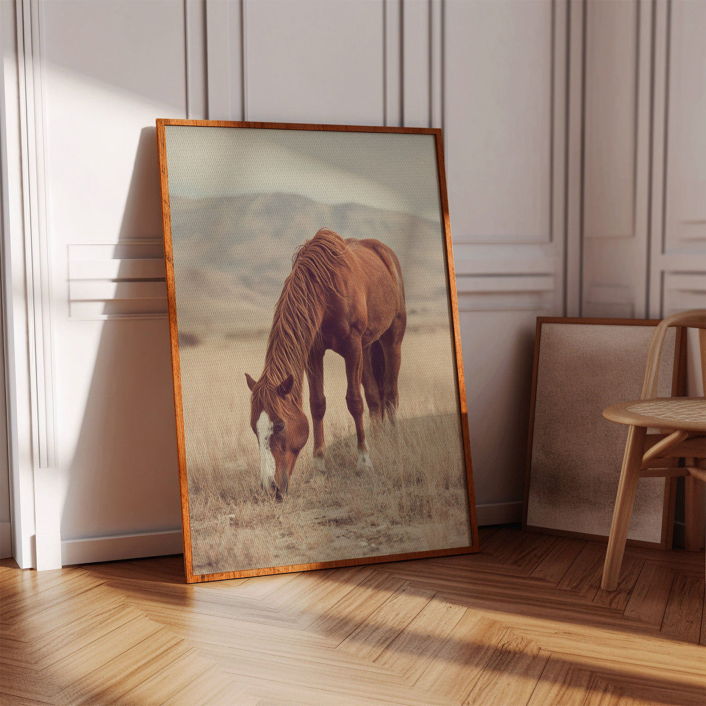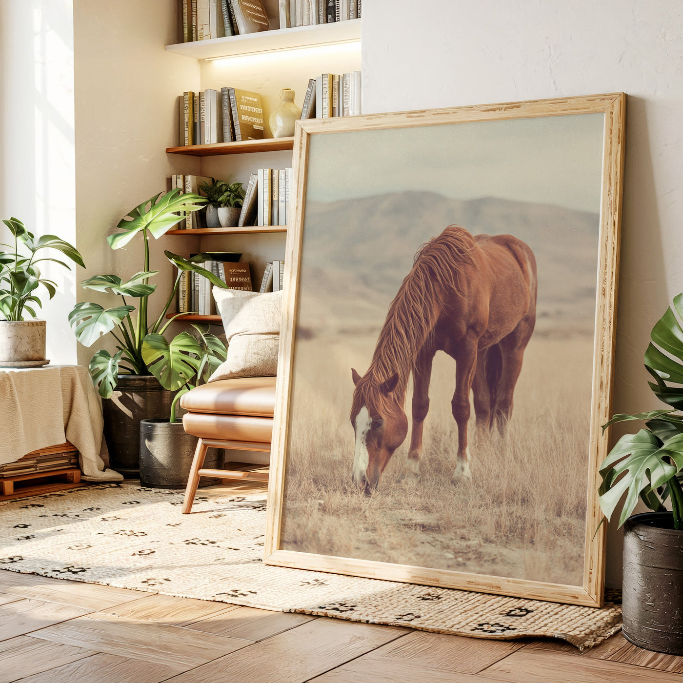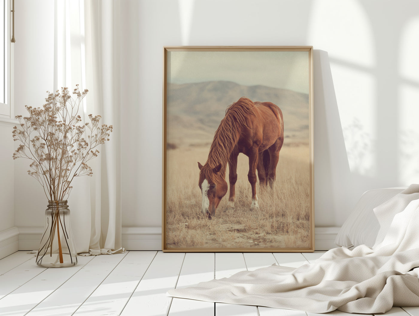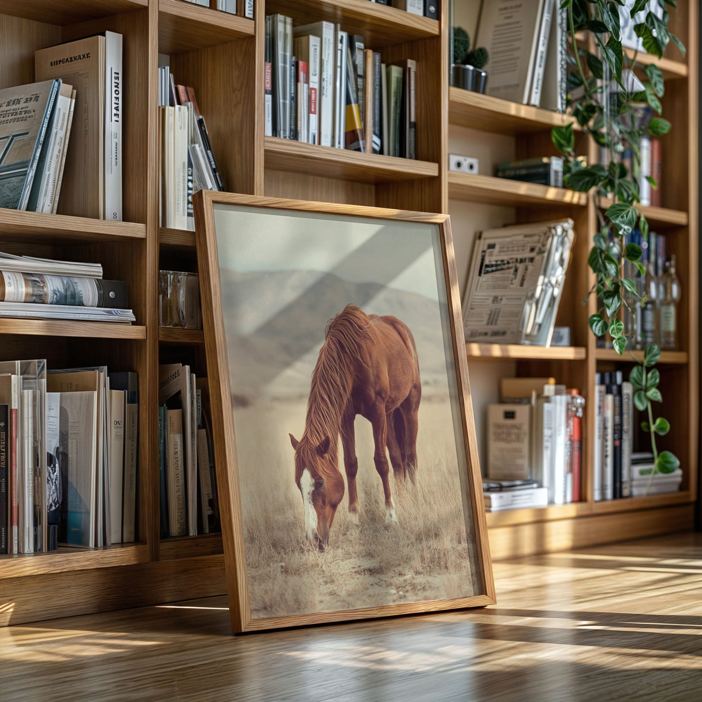 In the golden hour light, a magnificent paint horse stands sentinel in the wild grassland, embodying everything we love about these noble creatures—their quiet strength, their untamed spirit, and their profound connection to the open range. This is freedom captured in a single frame. Part of our Wild Spirits collection, this powerful black and w...