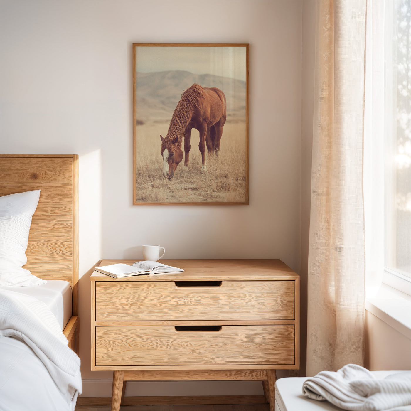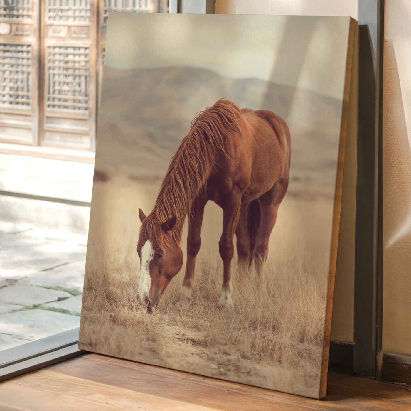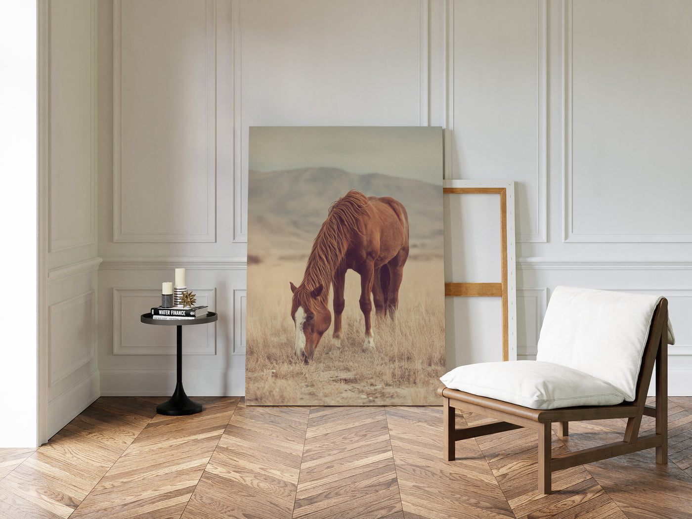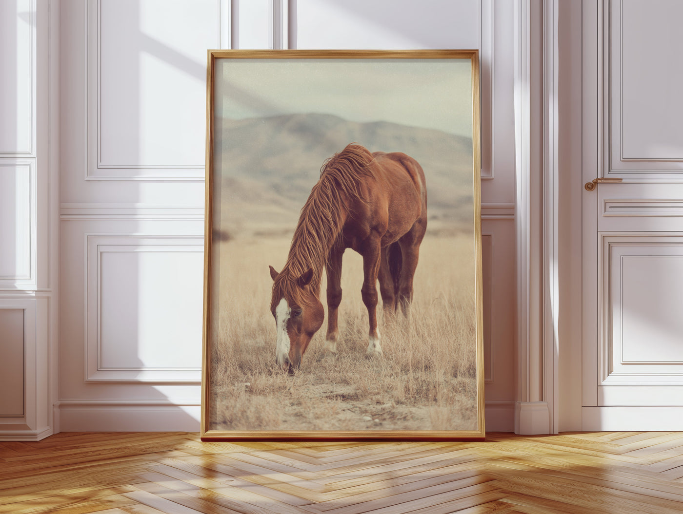 In the golden hour light, a magnificent paint horse stands sentinel in the wild grassland, embodying everything we love about these noble creatures—their quiet strength, their untamed spirit, and their profound connection to the open range. This is freedom captured in a single frame. Part of our Wild Spirits collection, this powerful black and w...