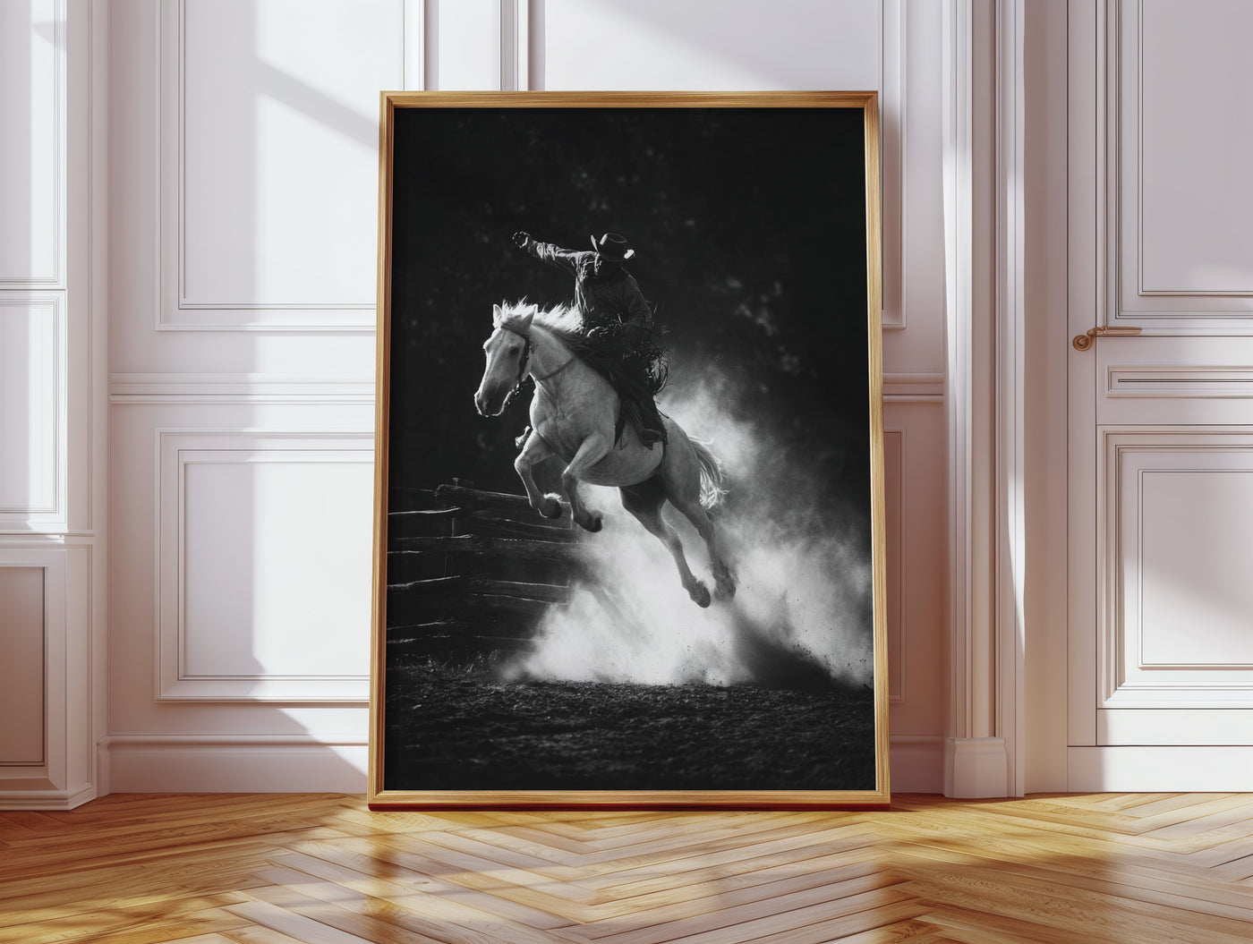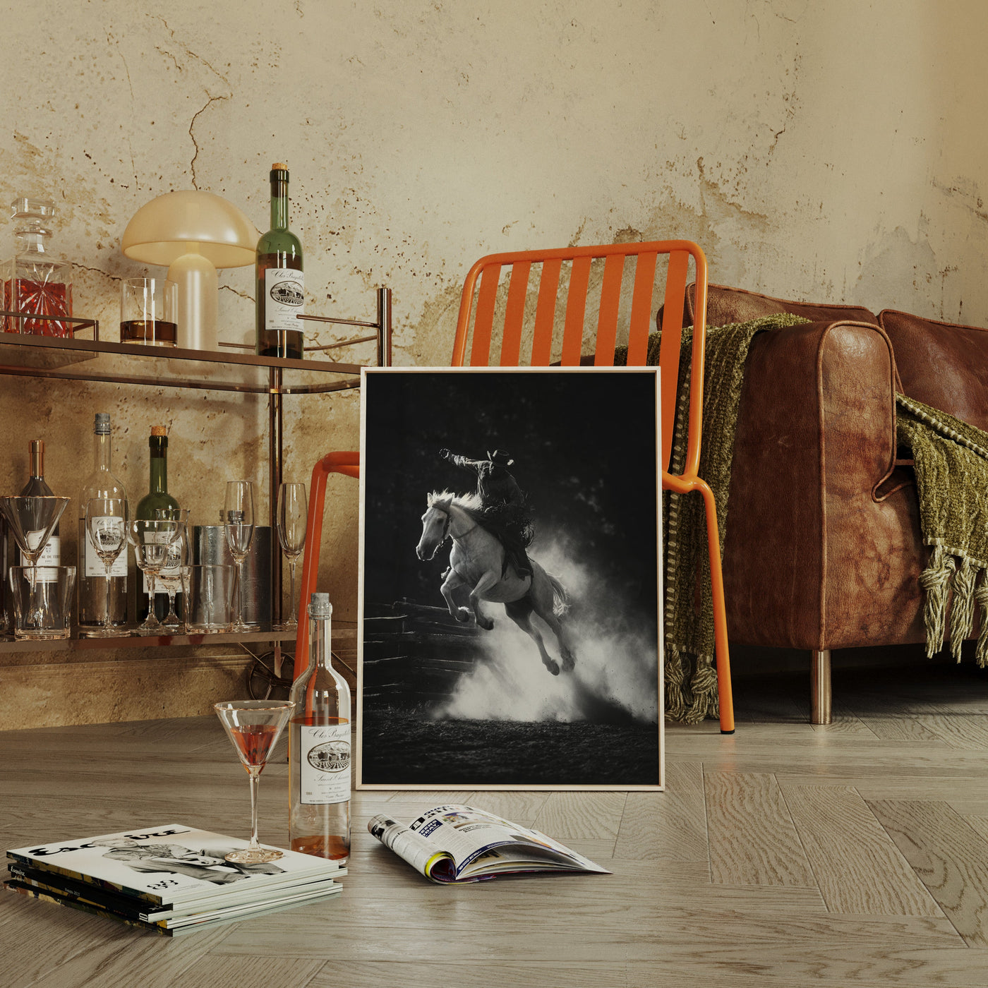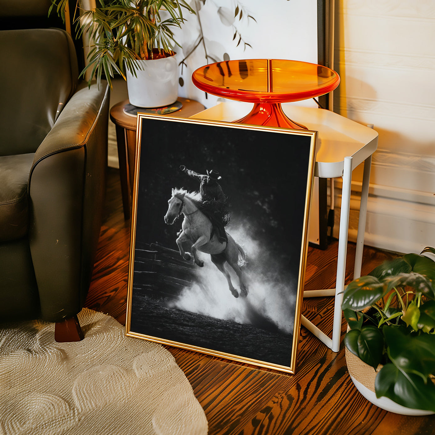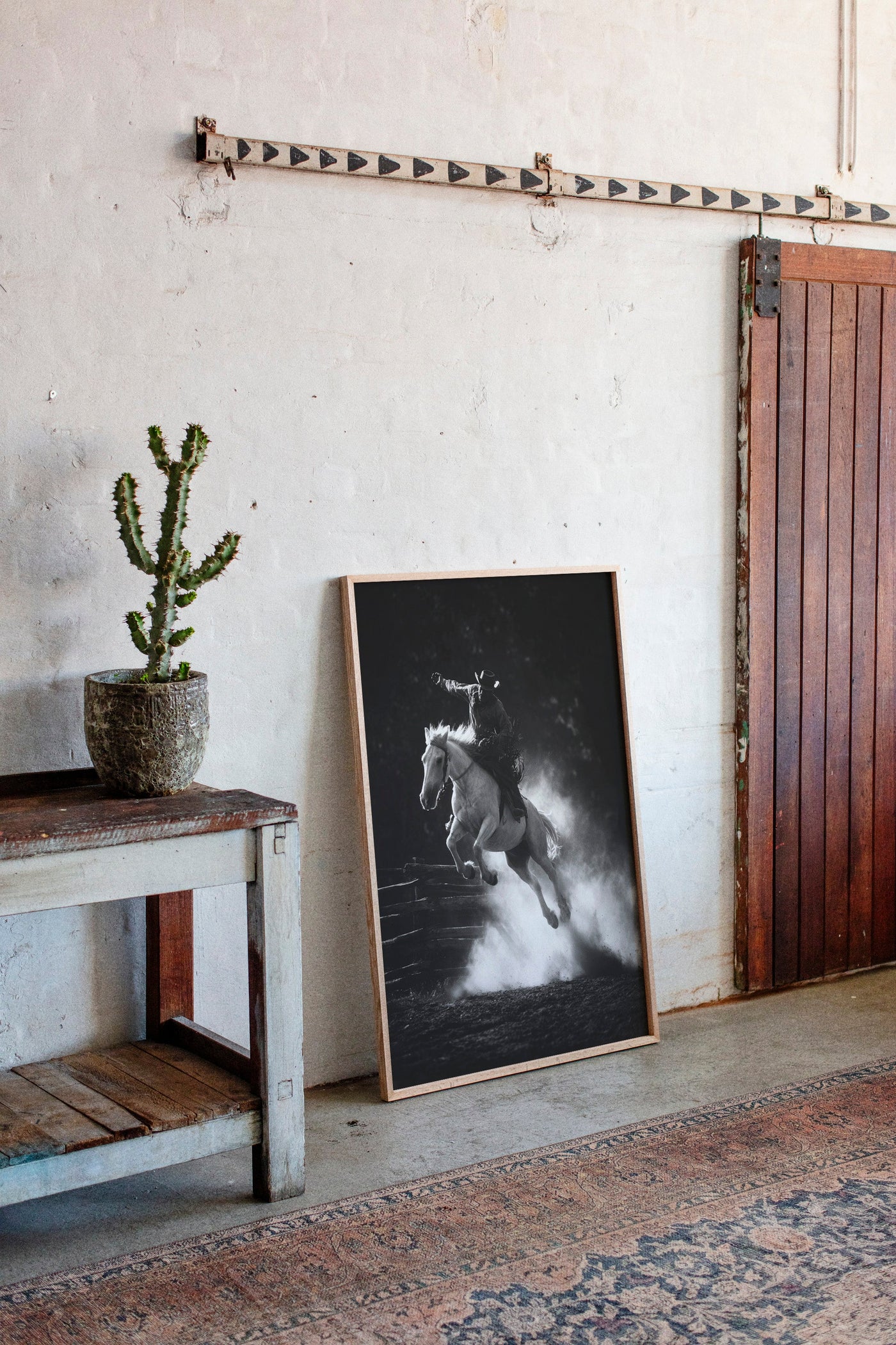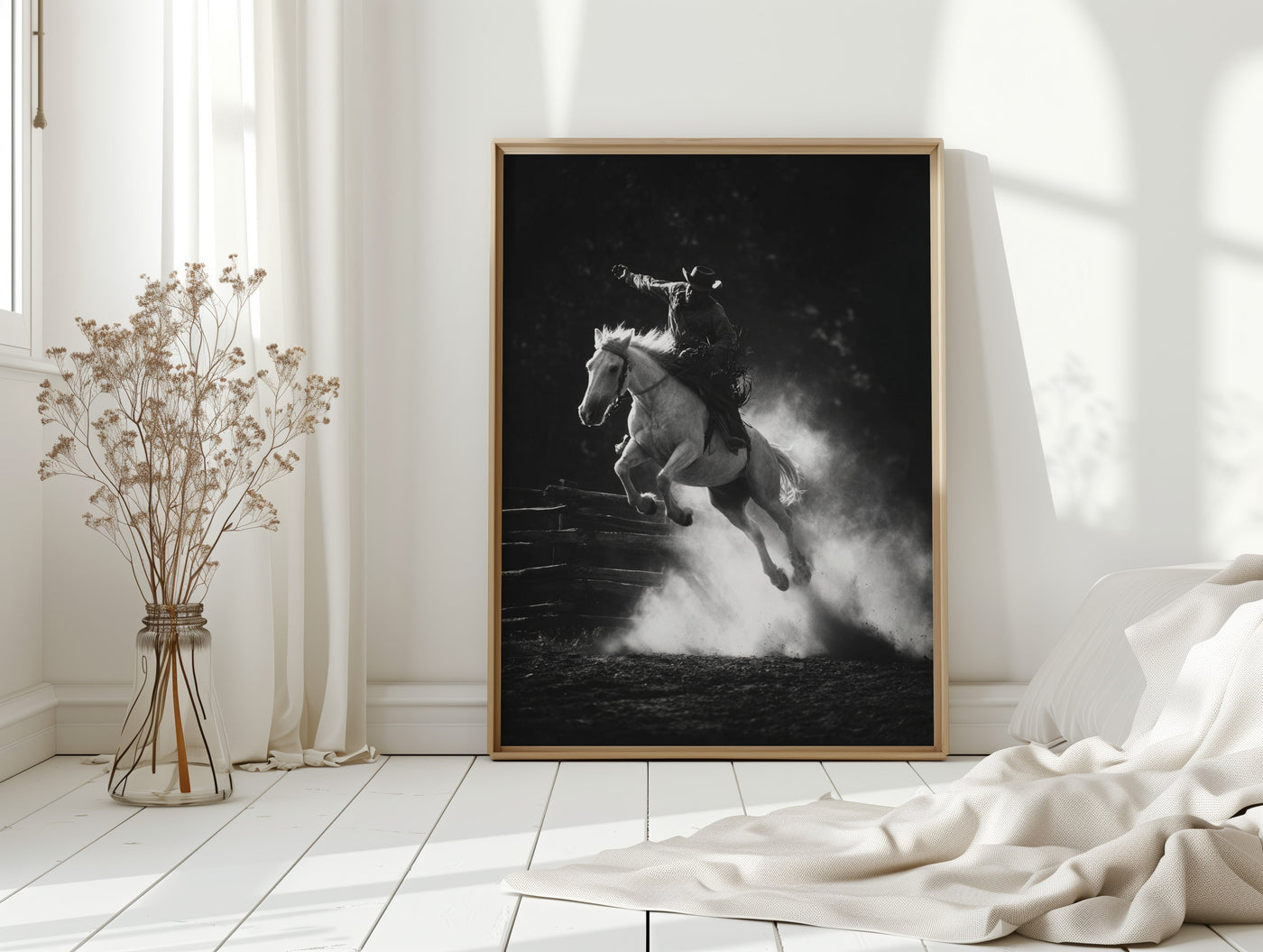 Through the swirling dust of a summer roundup, a lone rider emerges like a vision from another time. There's something almost supernatural about this moment—the way light catches the particles in the air, creating an otherworldly veil around horse and rider. Part of our Frontier Legends collection, this atmospheric photograph transforms an every...