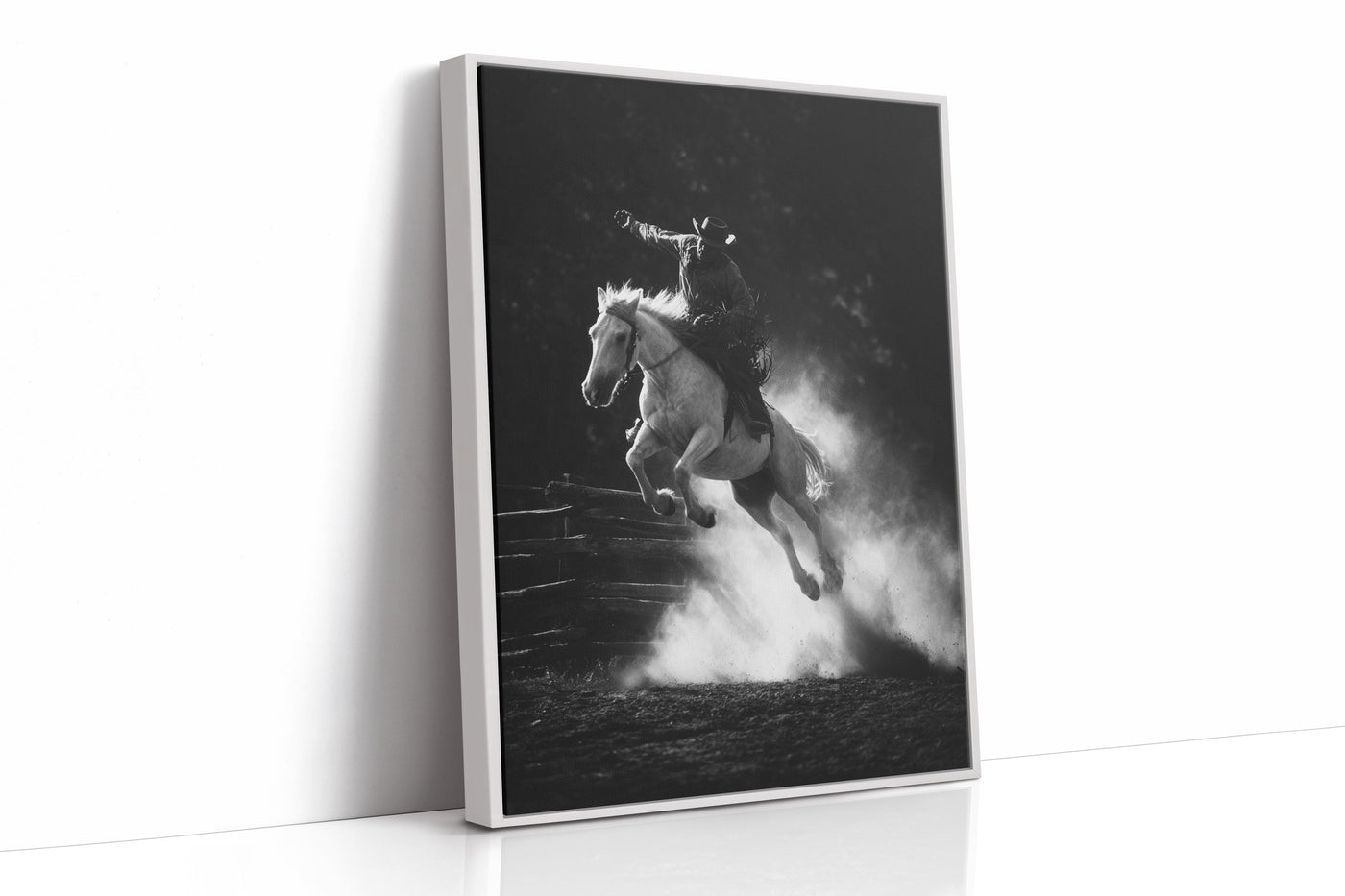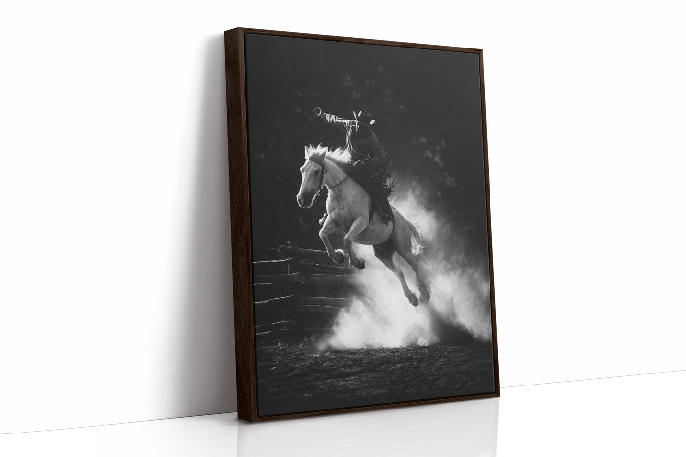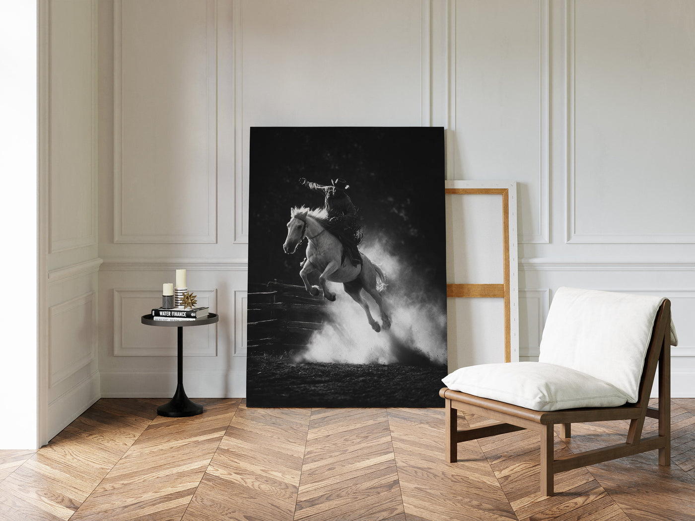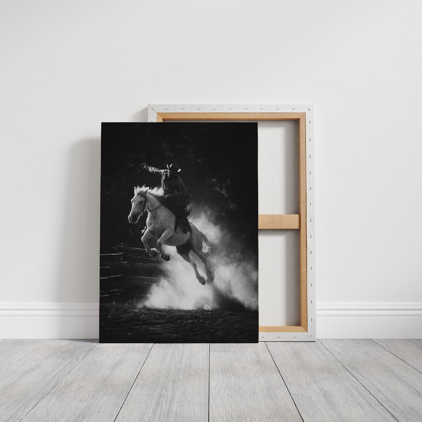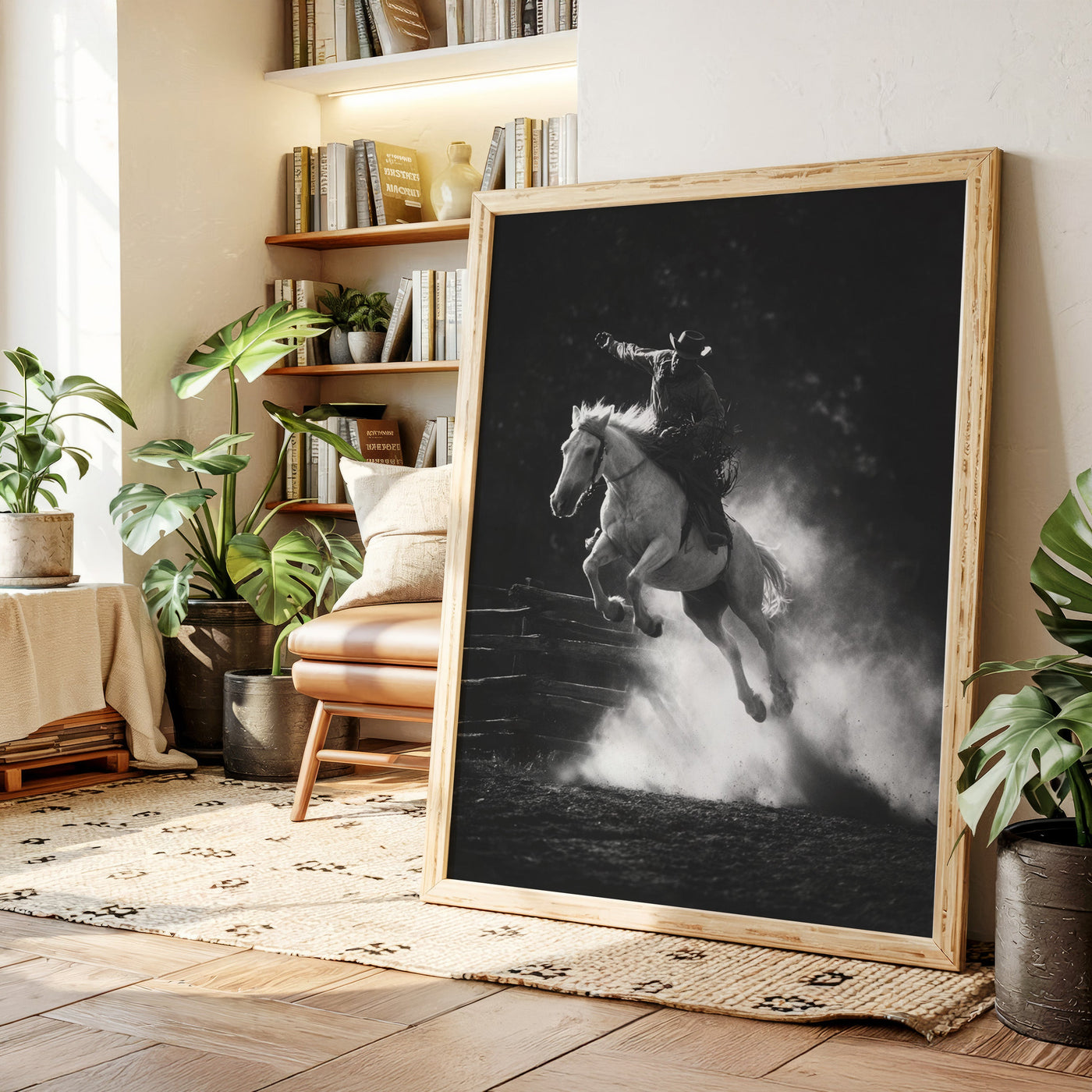 Through the swirling dust of a summer roundup, a lone rider emerges like a vision from another time. There's something almost supernatural about this moment—the way light catches the particles in the air, creating an otherworldly veil around horse and rider. Part of our Frontier Legends collection, this atmospheric photograph transforms an every...