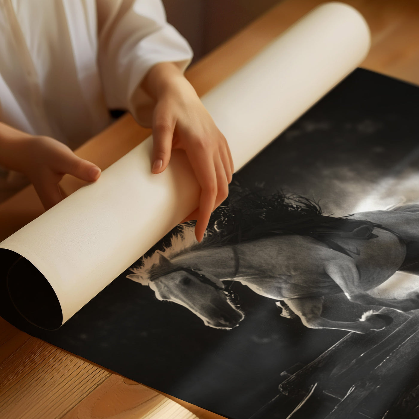 In the golden hour light, a magnificent paint horse stands sentinel in the wild grassland, embodying everything we love about these noble creatures—their quiet strength, their untamed spirit, and their profound connection to the open range. This is freedom captured in a single frame. Part of our Wild Spirits collection, this powerful black and w...