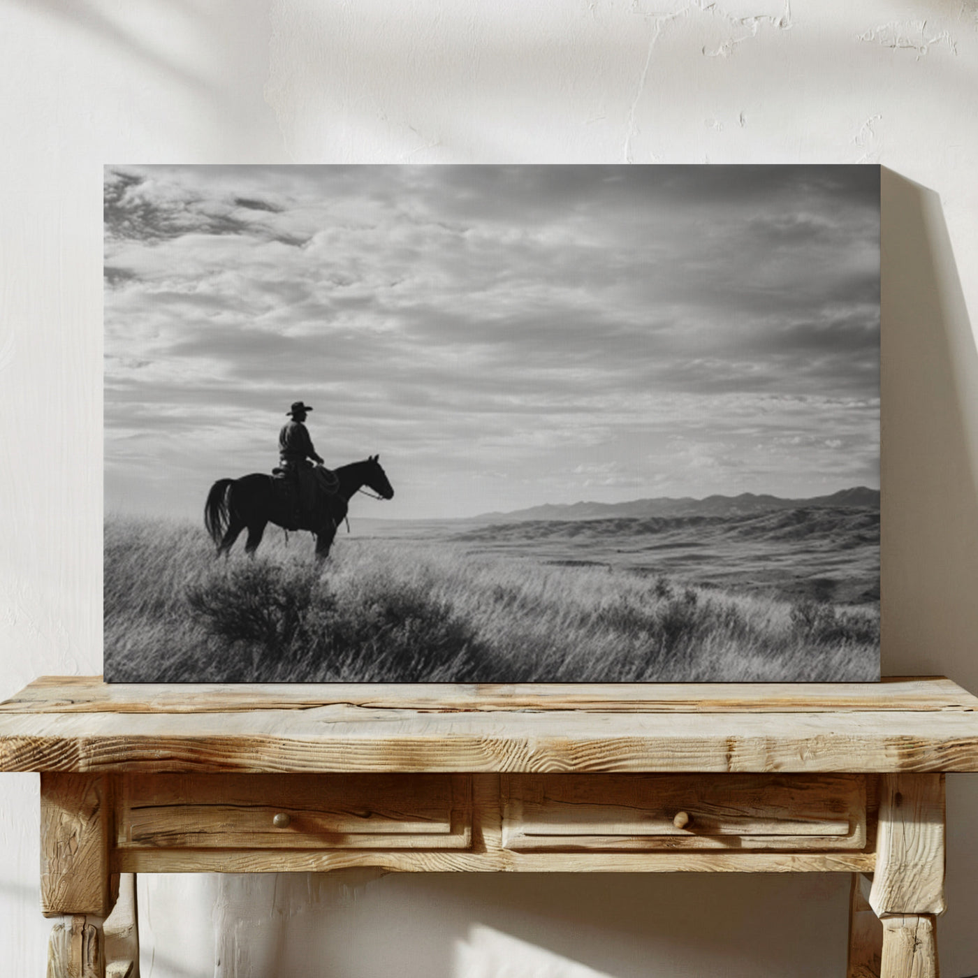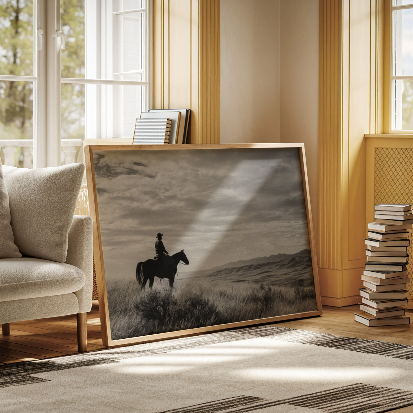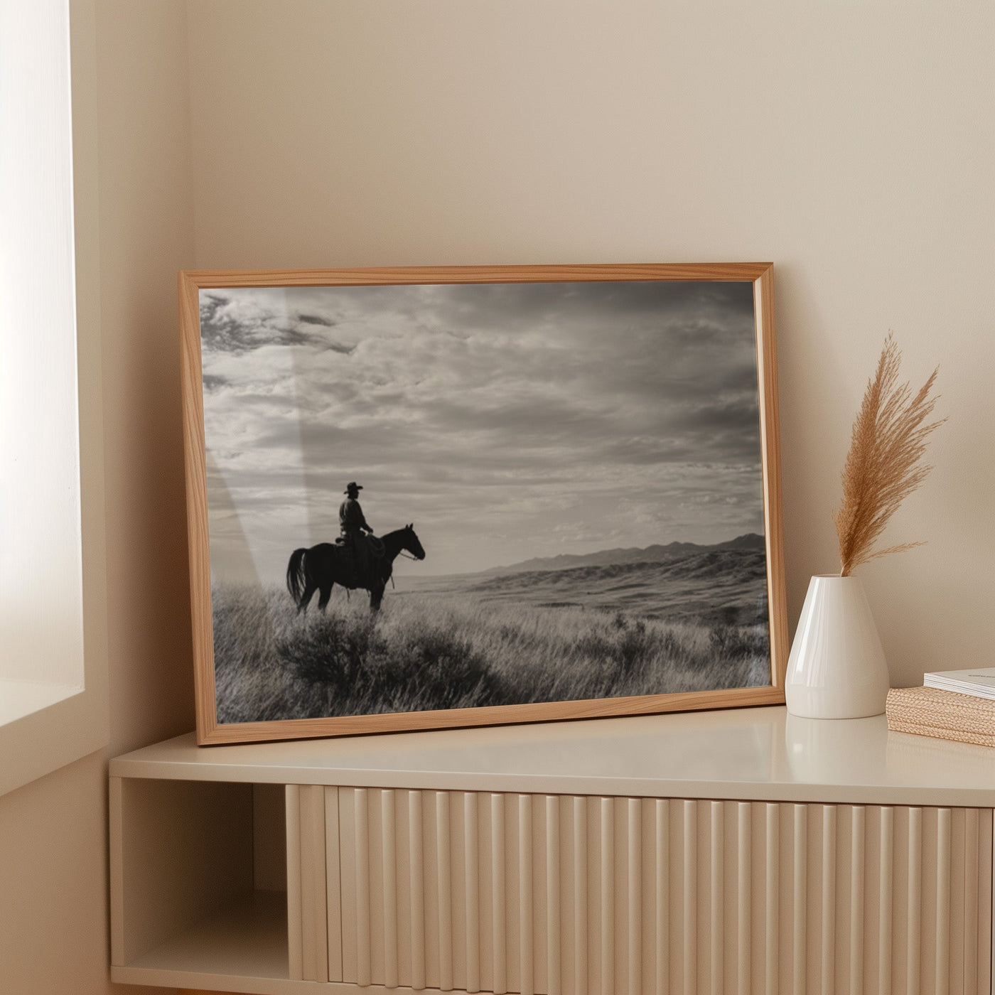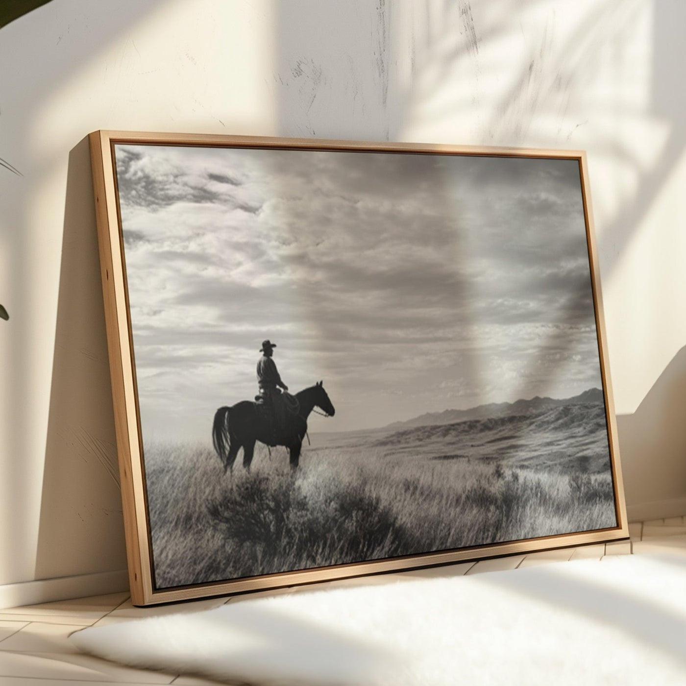 Through the swirling dust of a summer roundup, a lone rider emerges like a vision from another time. There's something almost supernatural about this moment—the way light catches the particles in the air, creating an otherworldly veil around horse and rider. Part of our Frontier Legends collection, this atmospheric photograph transforms an every...