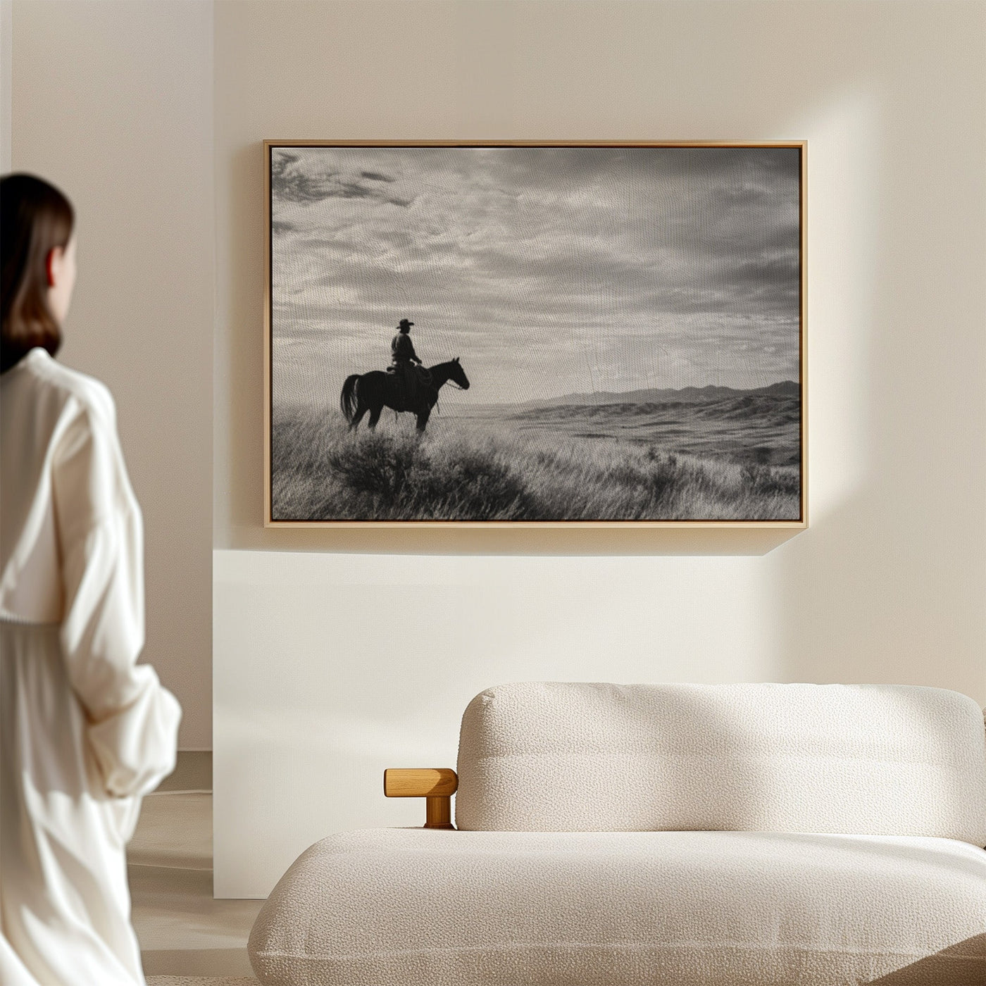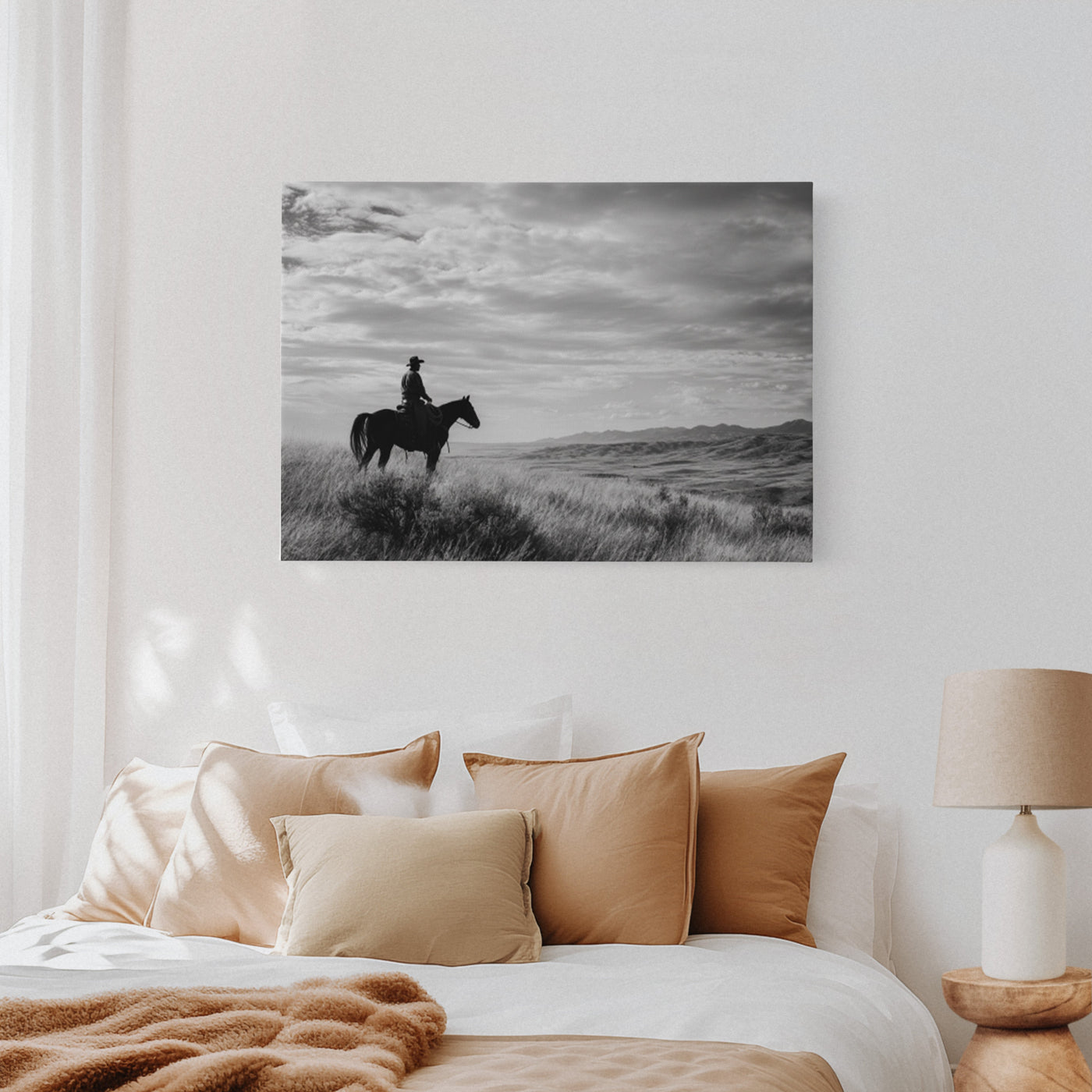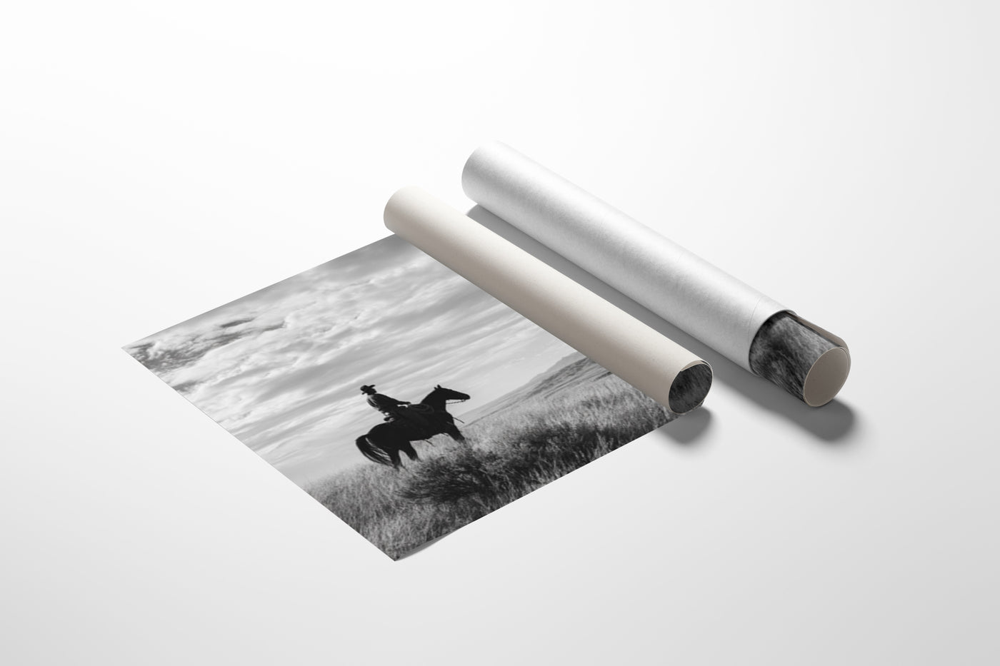 Through the swirling dust of a summer roundup, a lone rider emerges like a vision from another time. There's something almost supernatural about this moment—the way light catches the particles in the air, creating an otherworldly veil around horse and rider. Part of our Frontier Legends collection, this atmospheric photograph transforms an every...
