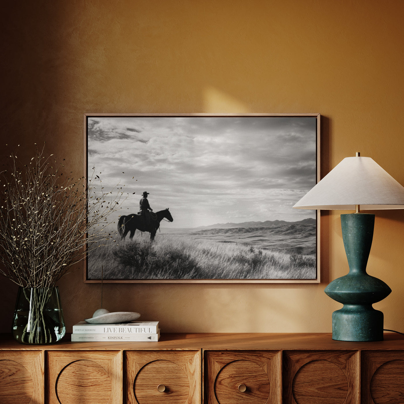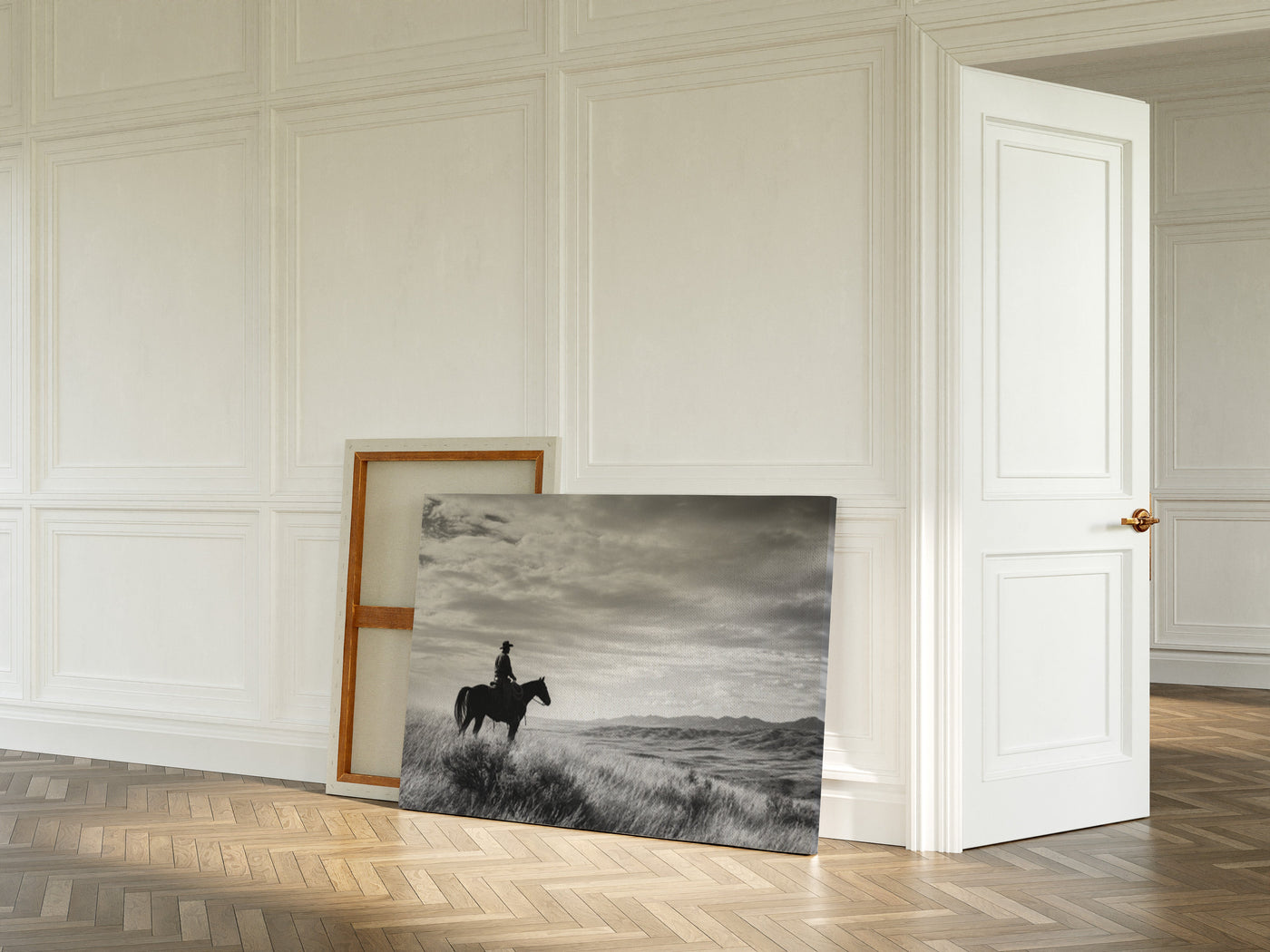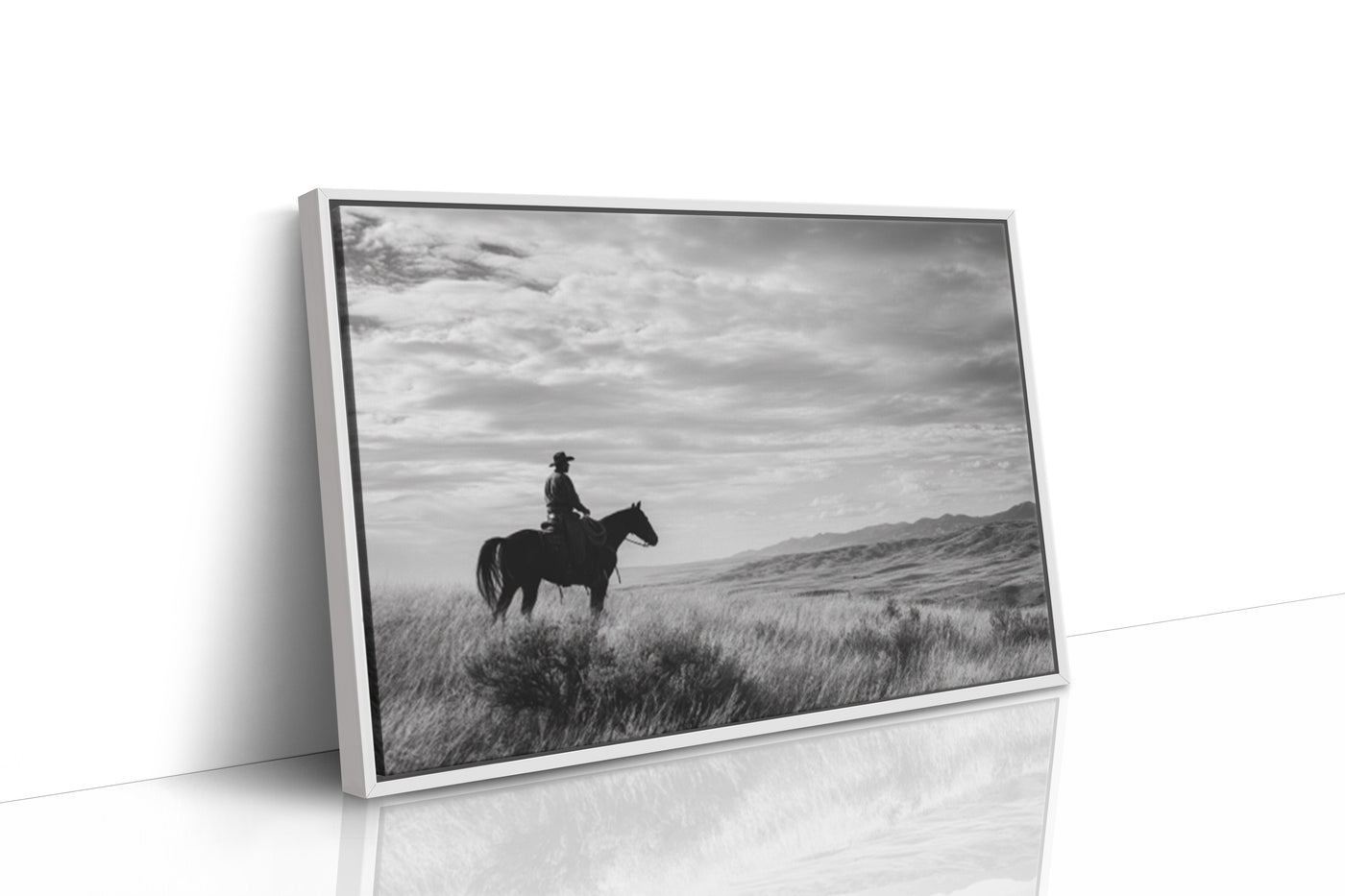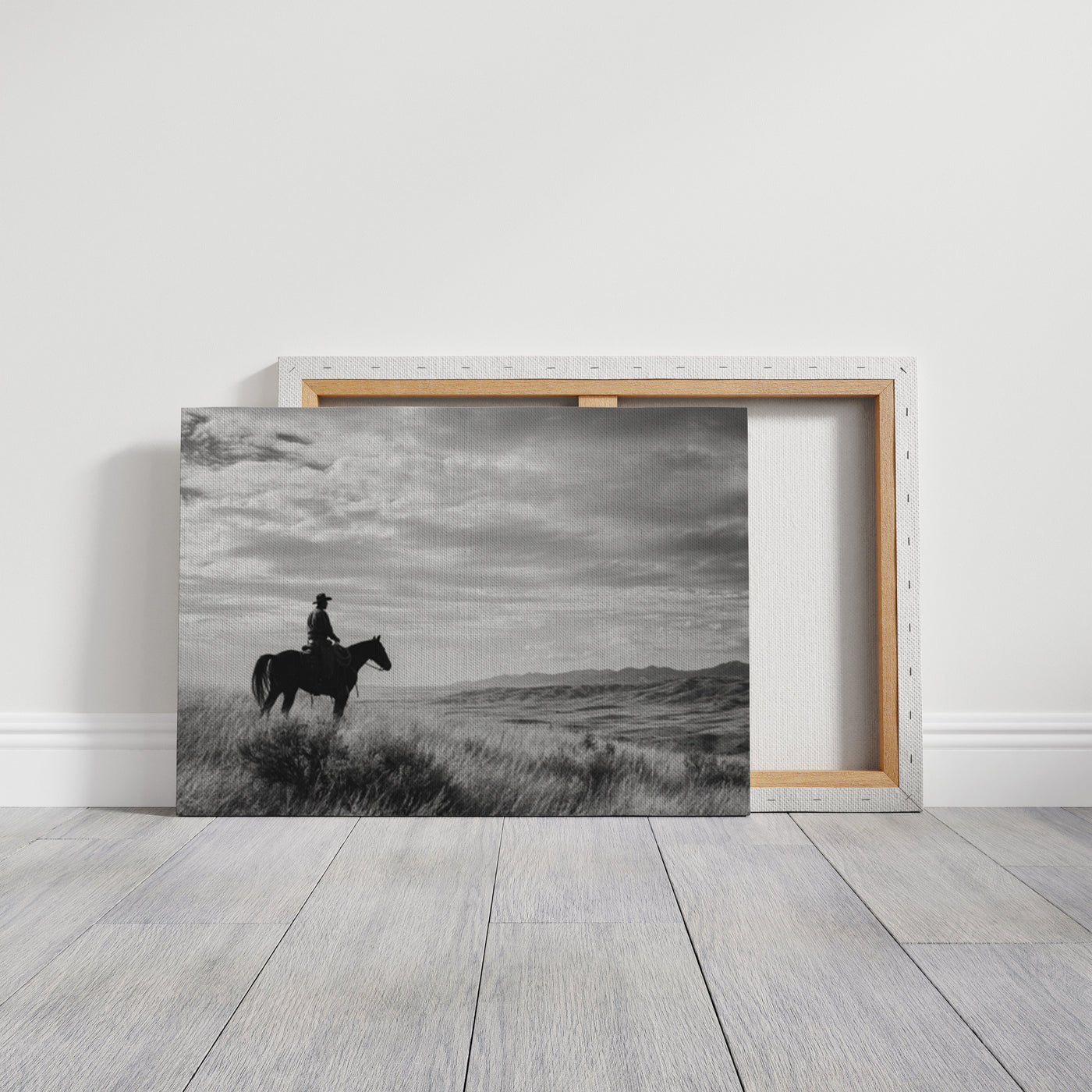 Through the swirling dust of a summer roundup, a lone rider emerges like a vision from another time. There's something almost supernatural about this moment—the way light catches the particles in the air, creating an otherworldly veil around horse and rider. Part of our Frontier Legends collection, this atmospheric photograph transforms an every...
