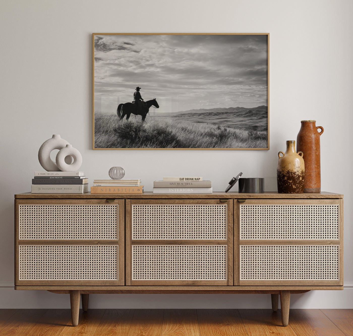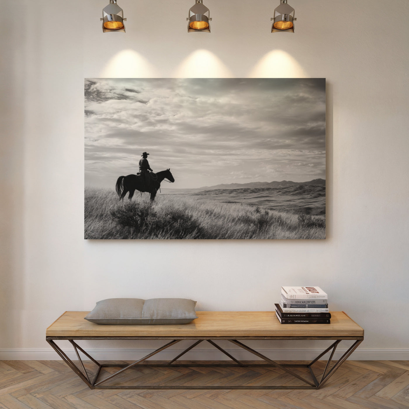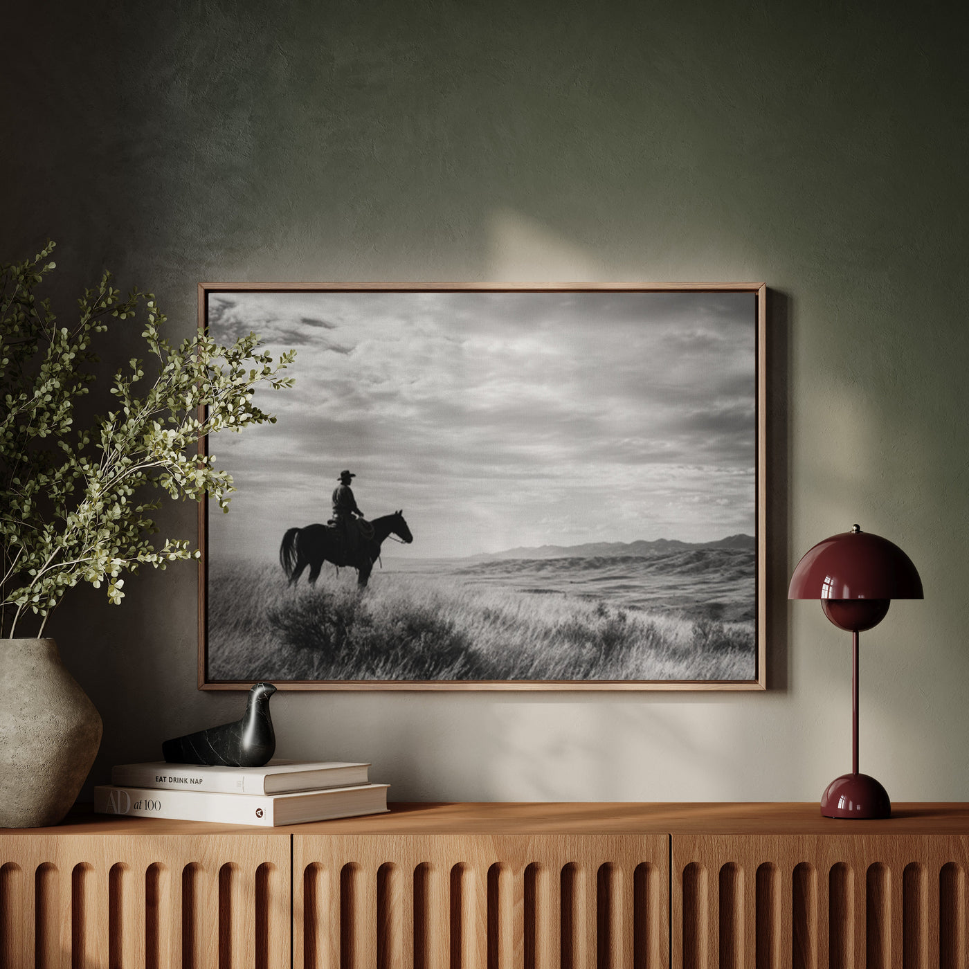 Across the vast plains where thunder once echoed in hoofbeats, this magnificent skull stands as a monument to untamed spirit. Each weathered curve tells stories of strength, endurance, and the wild heart of the American frontier. Captured in striking monochrome, this piece honors the majestic buffalo that once ruled the Great Plains. The dramati...