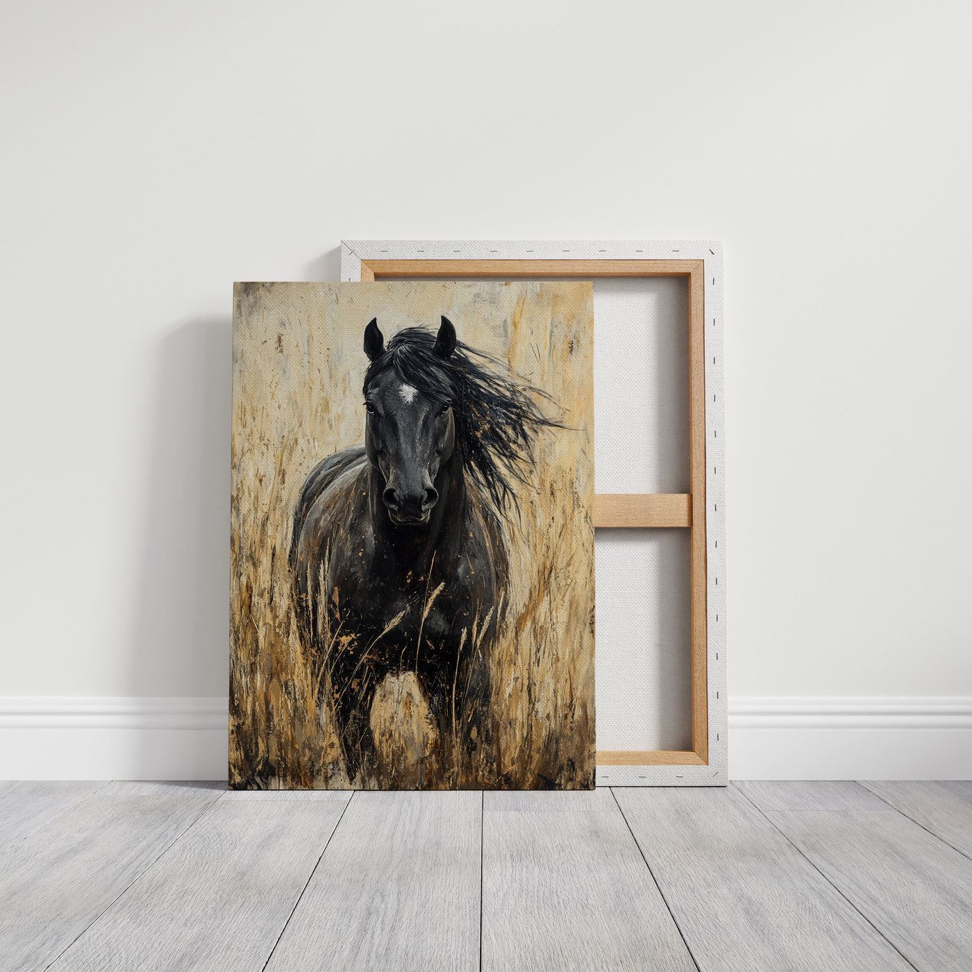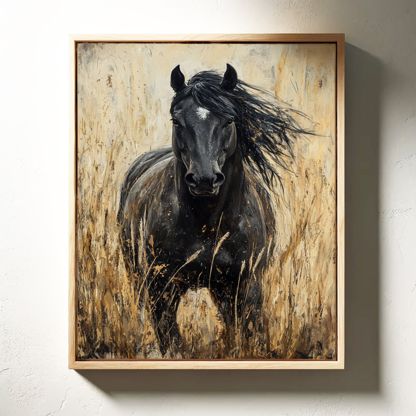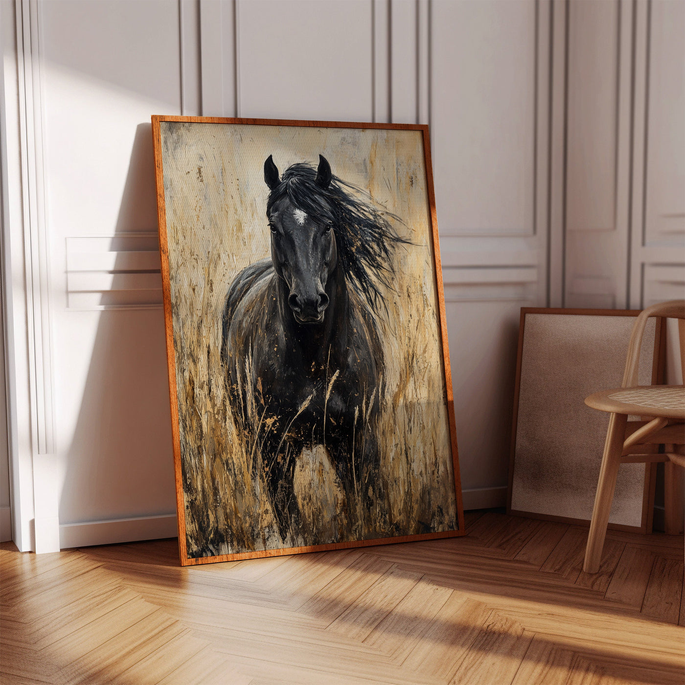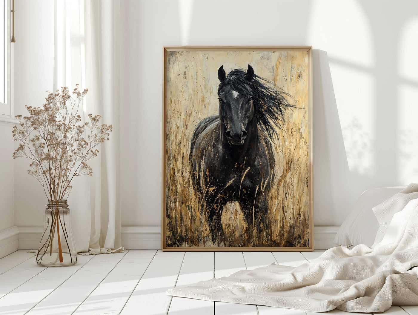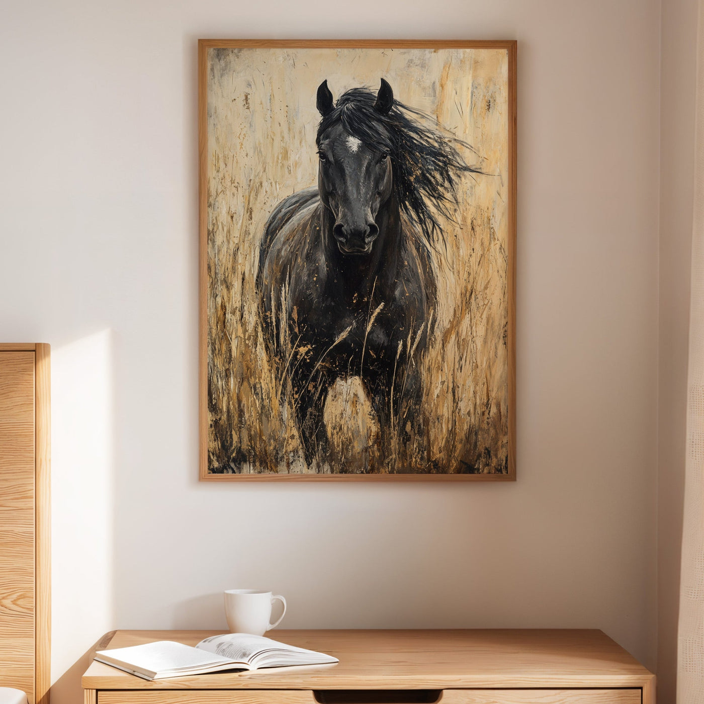 In the golden hour light, a magnificent paint horse stands sentinel in the wild grassland, embodying everything we love about these noble creatures—their quiet strength, their untamed spirit, and their profound connection to the open range. This is freedom captured in a single frame. Part of our Wild Spirits collection, this powerful black and w...