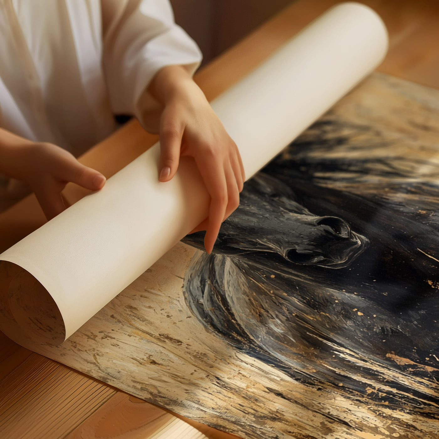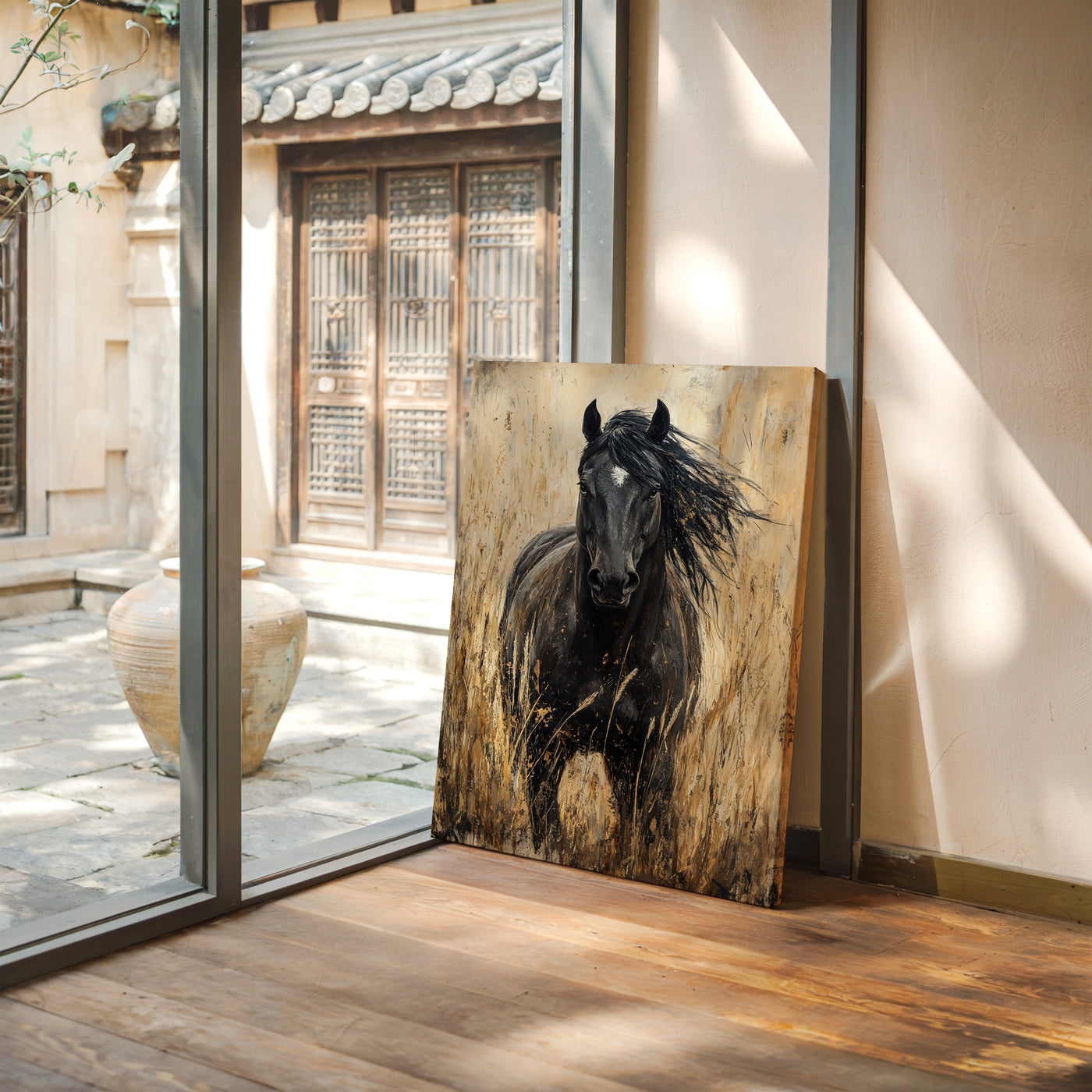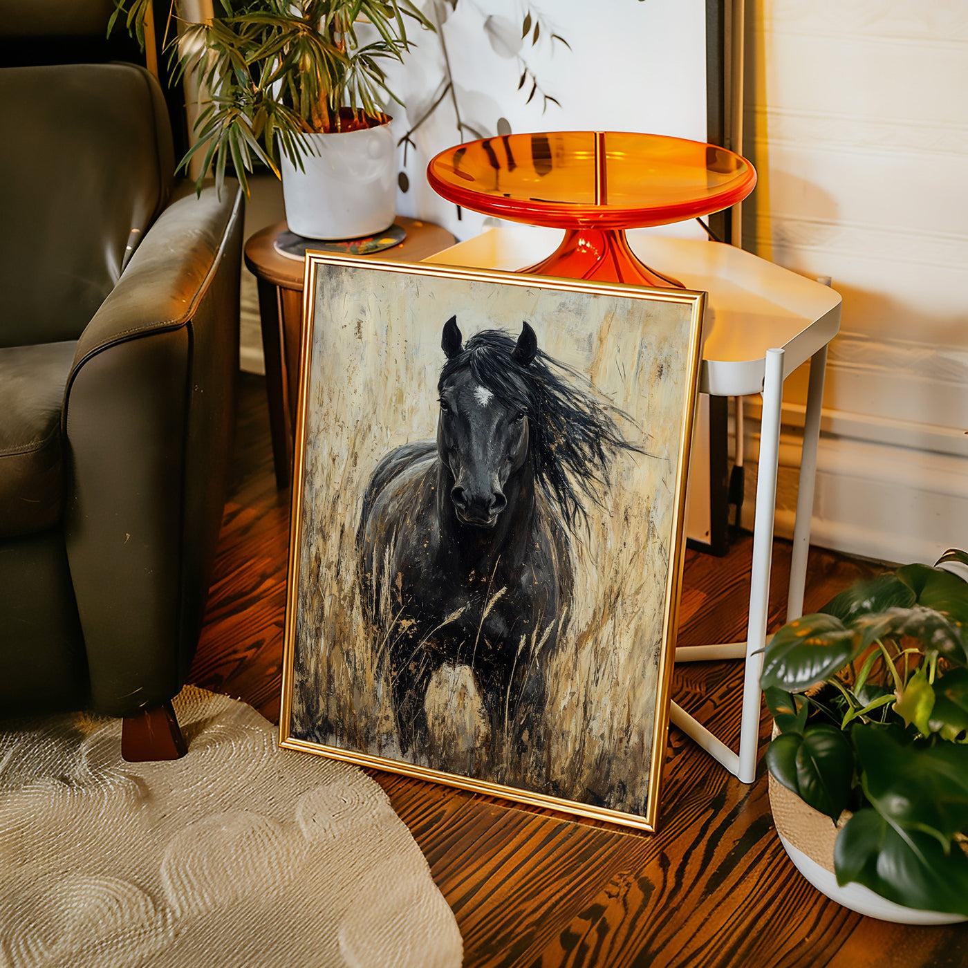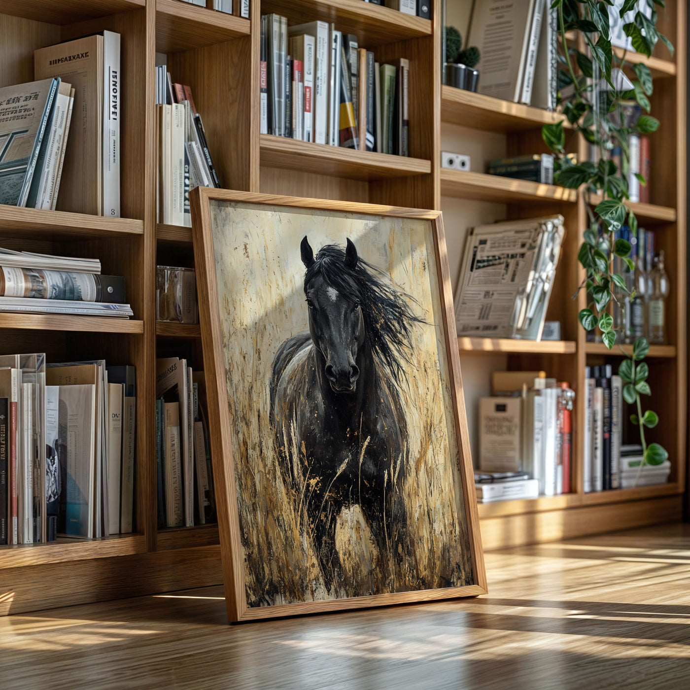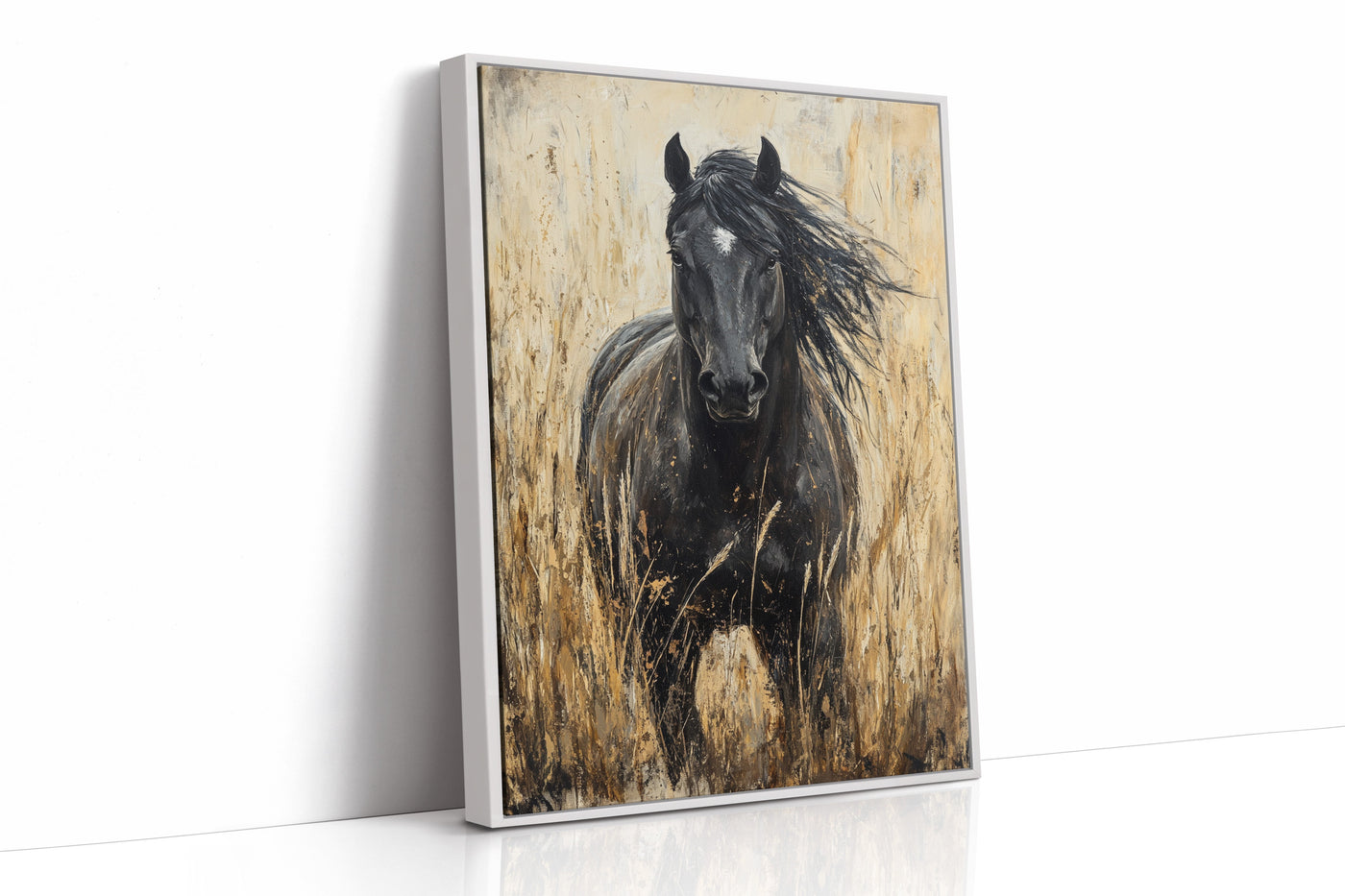 In the golden hour light, a magnificent paint horse stands sentinel in the wild grassland, embodying everything we love about these noble creatures—their quiet strength, their untamed spirit, and their profound connection to the open range. This is freedom captured in a single frame. Part of our Wild Spirits collection, this powerful black and w...