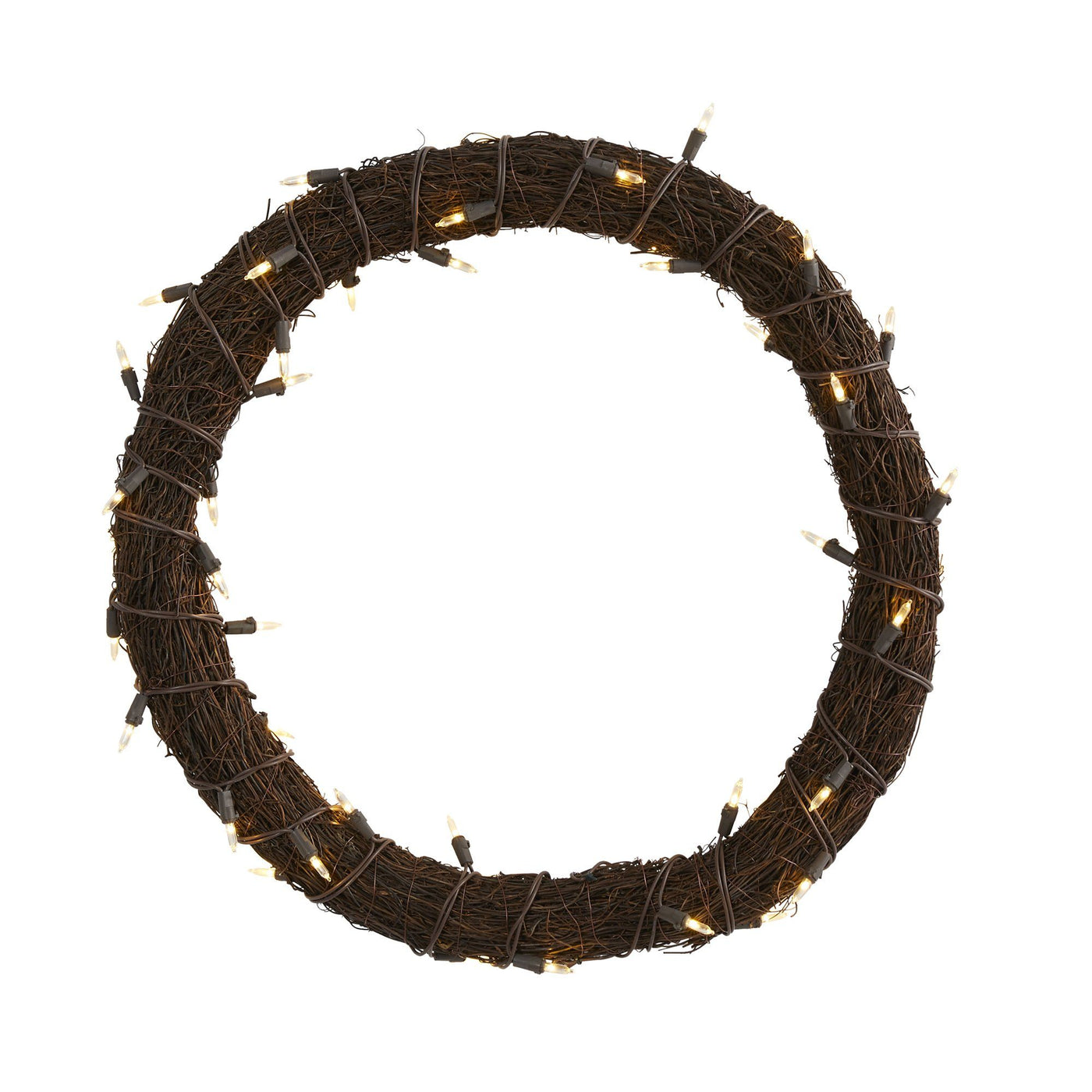 Add a little decorative accenting to an empty wall or doorway with the help of this artificial vine wreath. Intricately designed with a twig-like base, this decorative wreath comes already pre-strung with 50 warm white LED lights to give a soft, illuminating glow to an otherwise bare space. Great for year-round display, this 20” (in circumference) faux vine wreath would make for an inviting accent and would inject front-door appeal all year round.