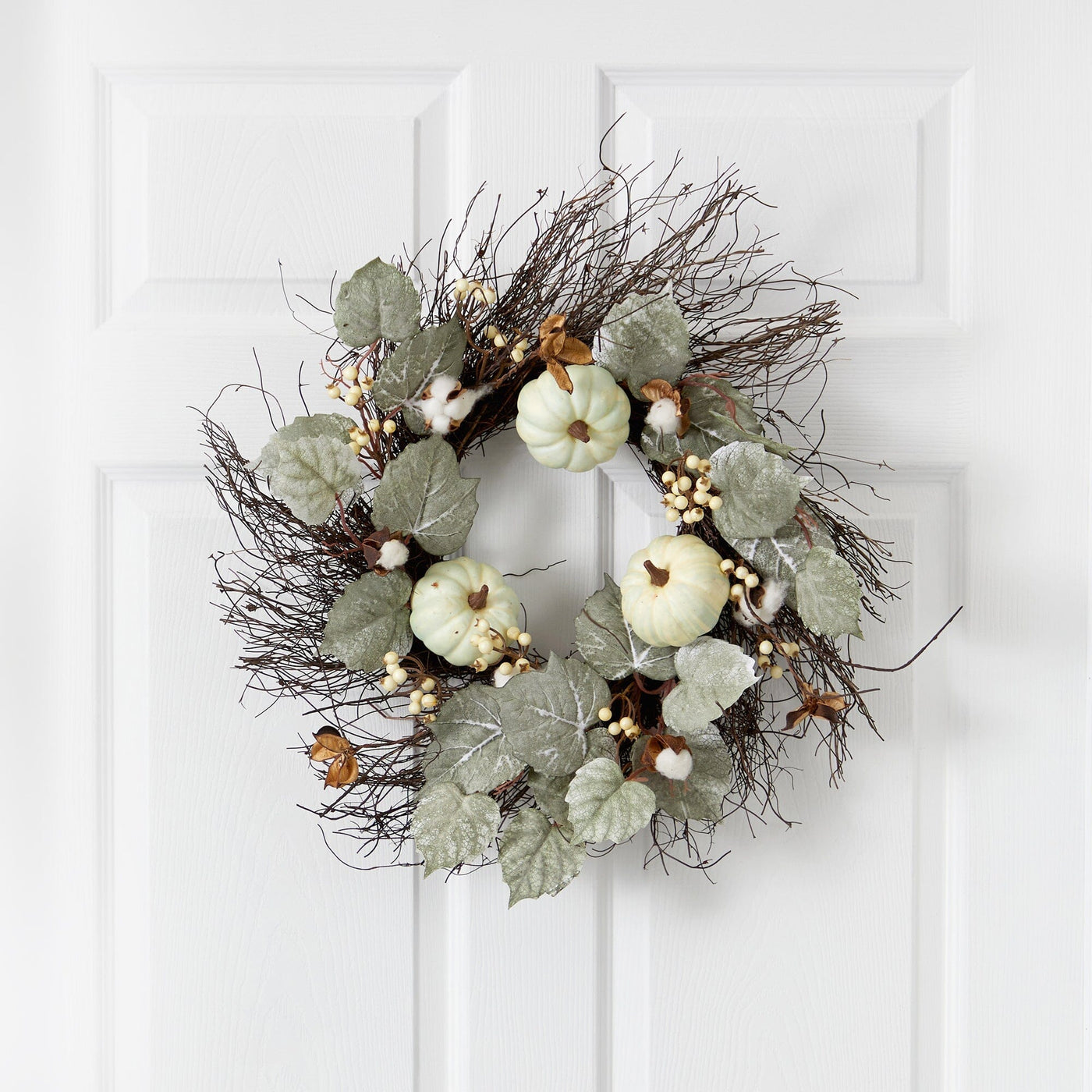 22” Autumn Green Pumpkin, Cotton and Berries Artificial Fall Wreath