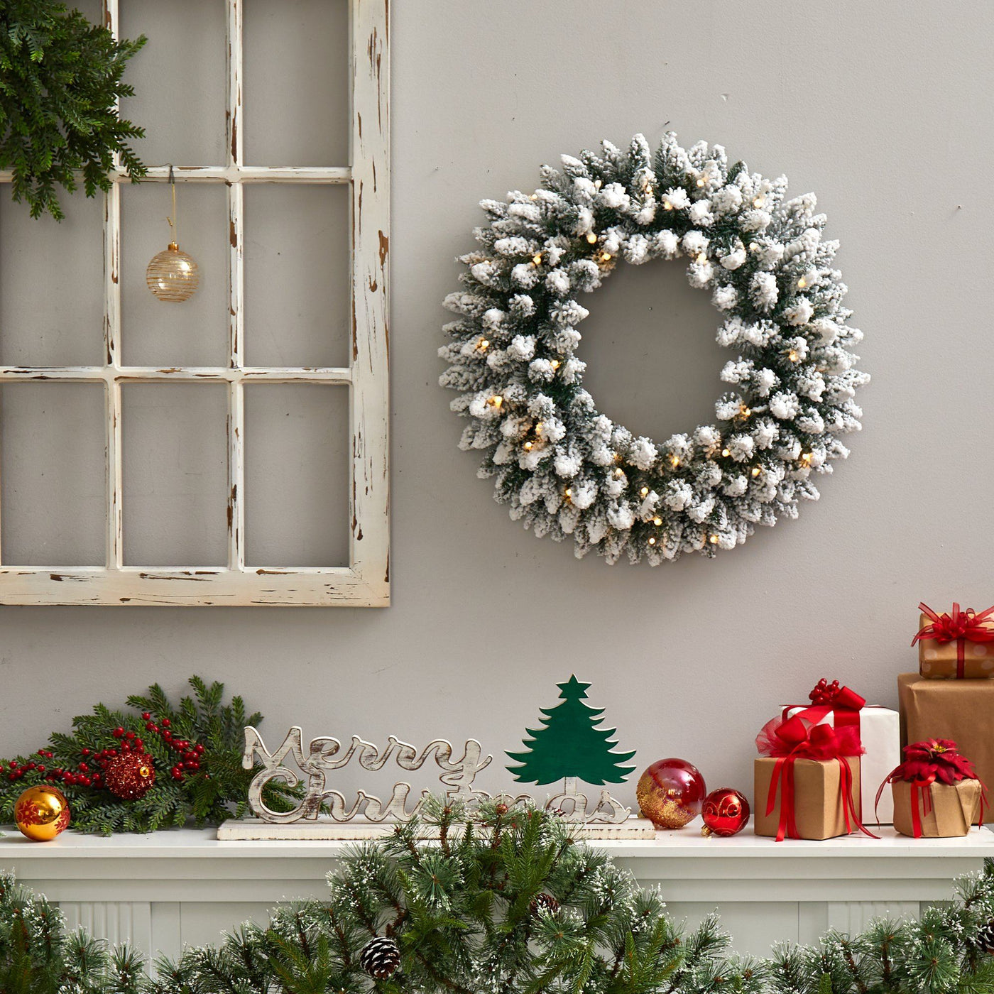 24” Flocked Artificial Christmas Wreath with 160 Bendable Branches and 35 Warm White LED Lights