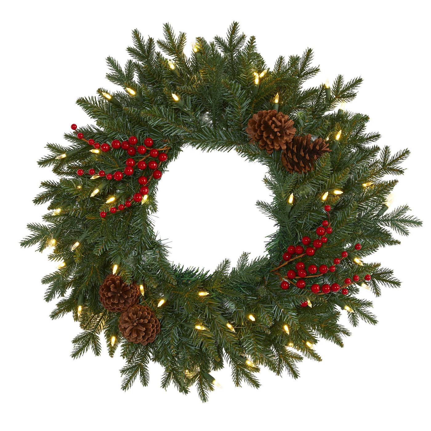 24” Green Pine Artificial Christmas Wreath with 50 Warm White LED Lights, Berries and Pine Cones