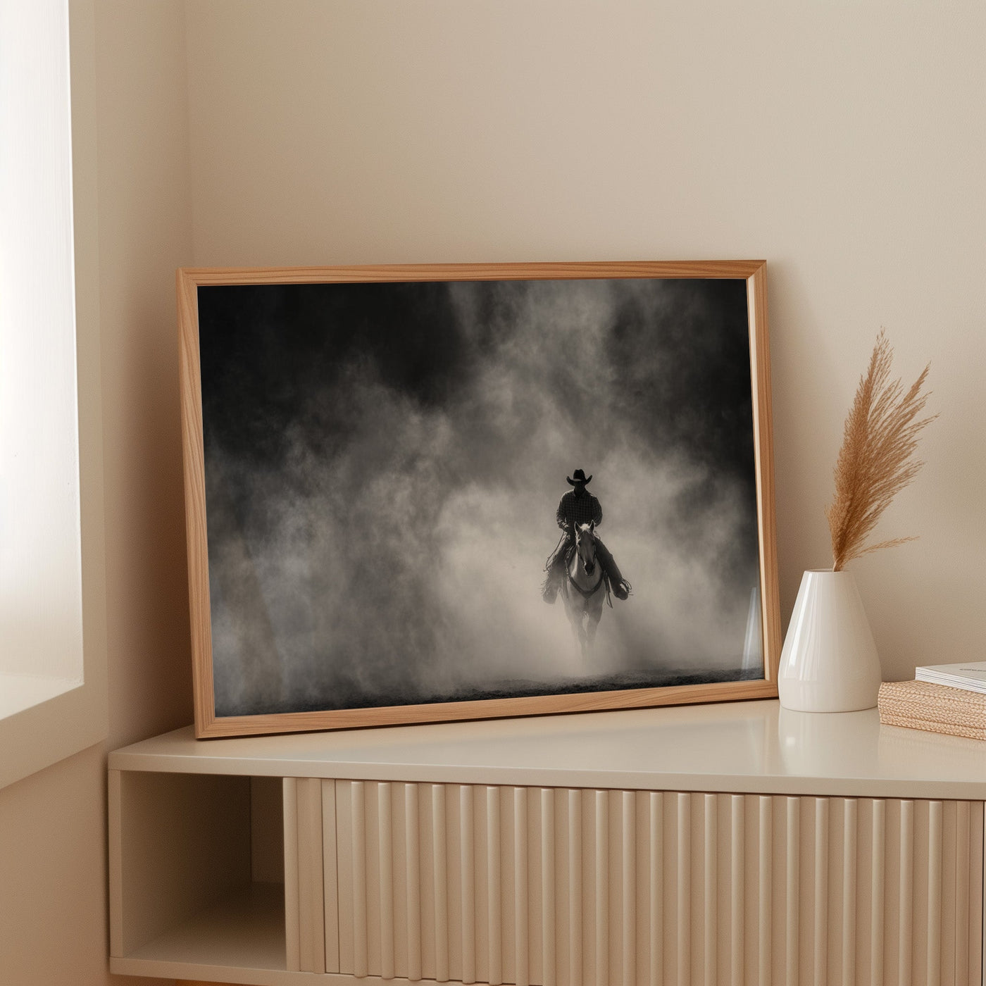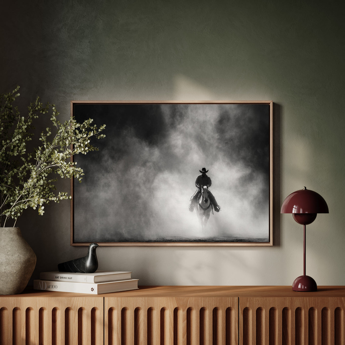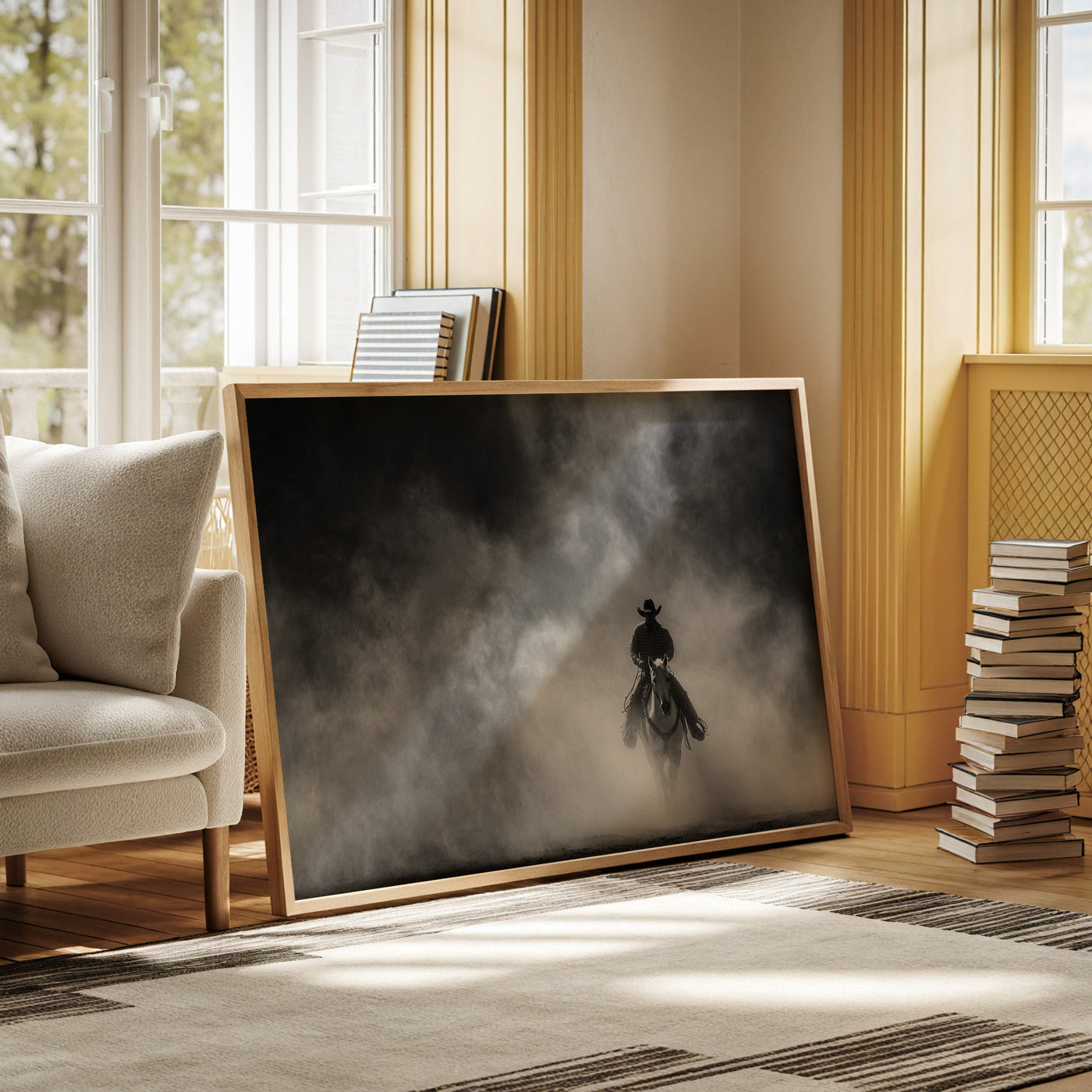 Part of our Frontier Legends collection, this atmospheric photograph transforms an everyday ranch scene into something transcendent. The dramatic interplay of light and shadow, dust and clarity, creates a sense of mystery that speaks to the mythic quality of the American West.