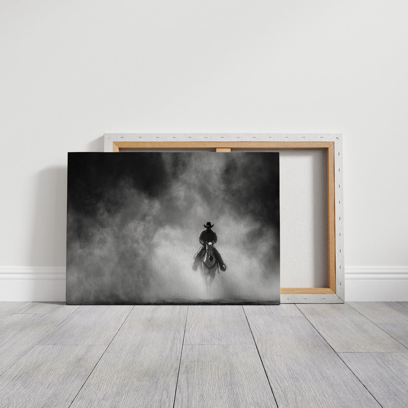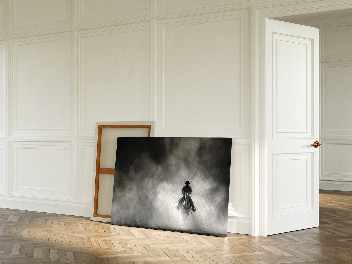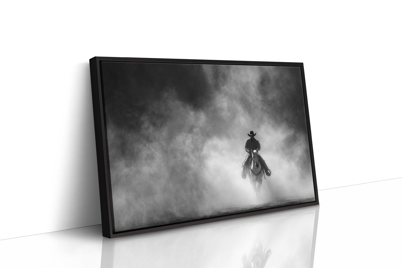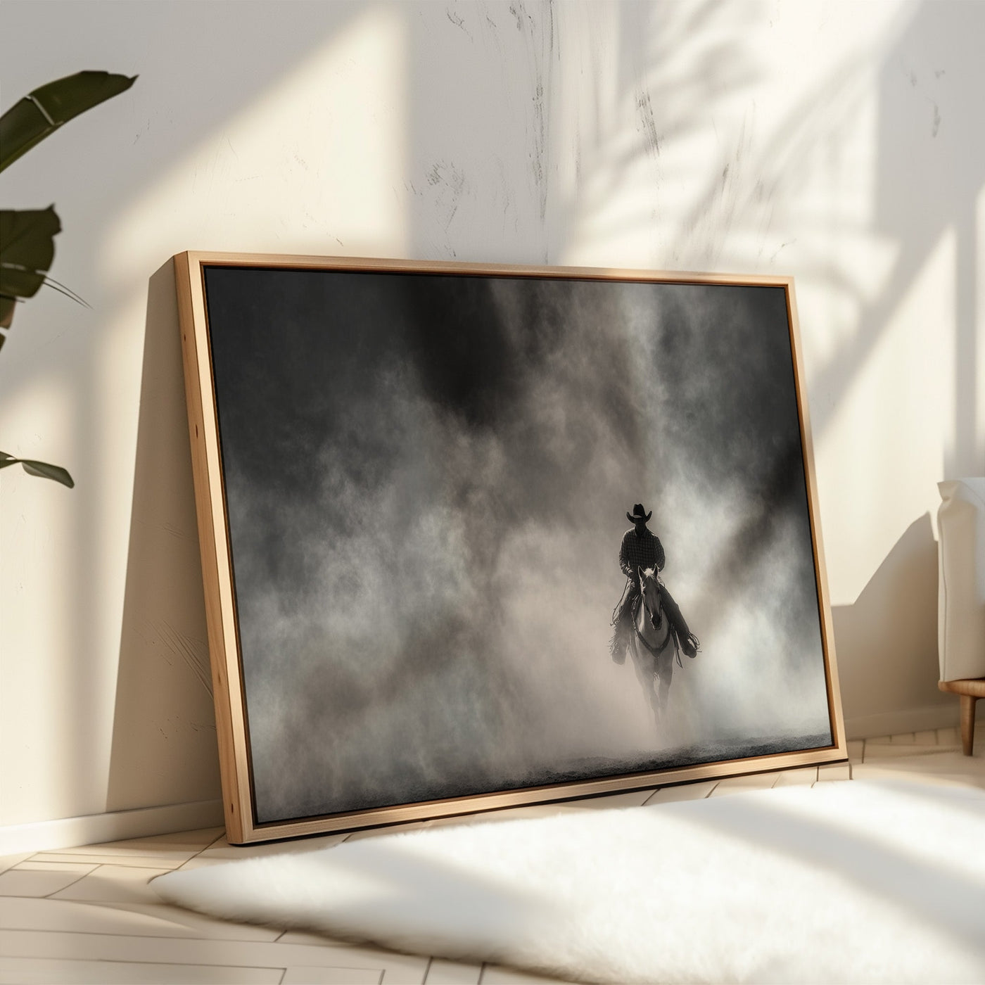 Part of our Frontier Legends collection, this atmospheric photograph transforms an everyday ranch scene into something transcendent. The dramatic interplay of light and shadow, dust and clarity, creates a sense of mystery that speaks to the mythic quality of the American West.