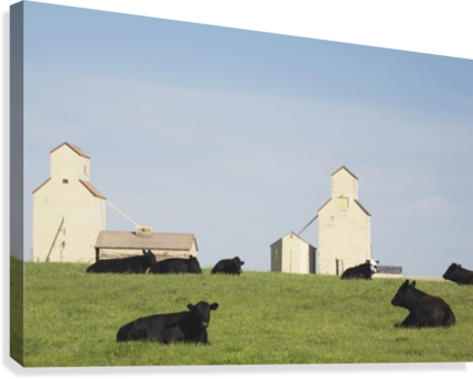 Cattle In A Field With Grain Elevators