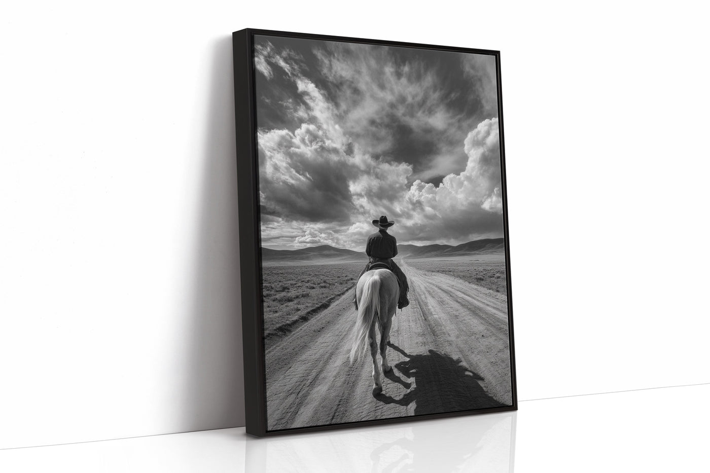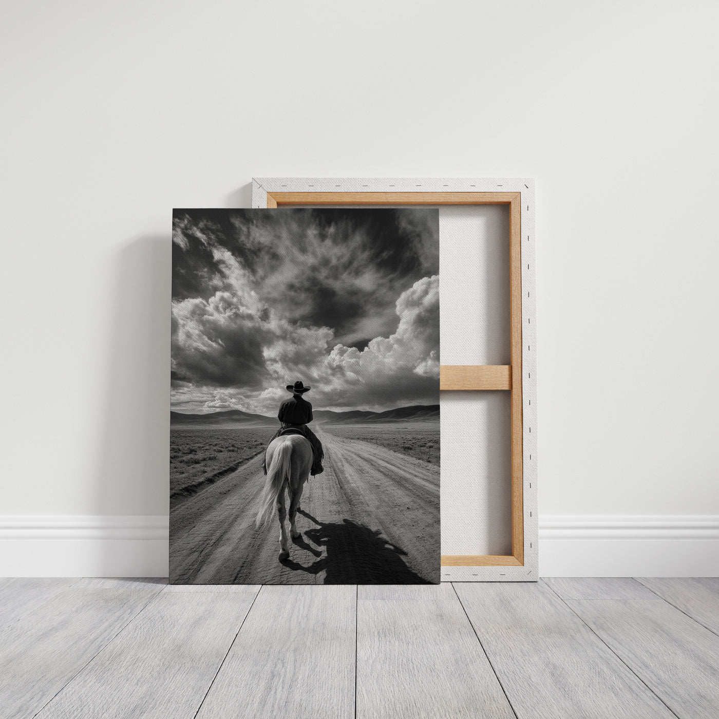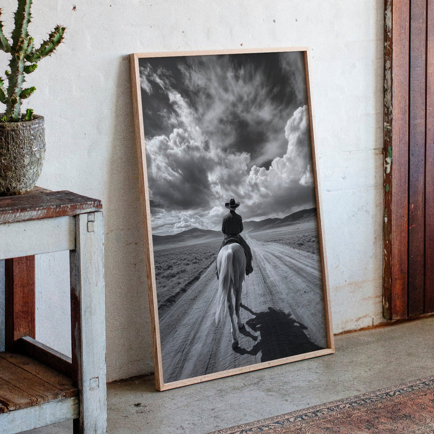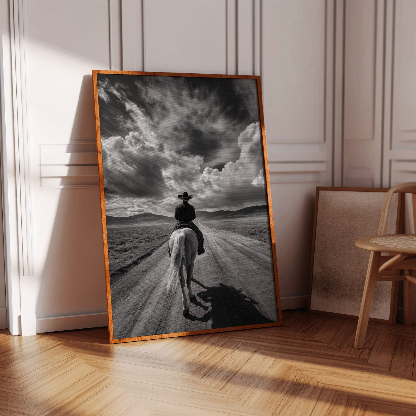 Perfect for inspiring perseverance in home offices, adding dramatic character to living rooms, or bringing motivational energy to any space that celebrates the strength found in solitary determination. This piece speaks to anyone who has faced their own storms, lovers of classic western imagery, and those who find inspiration in the simple act of not giving up.