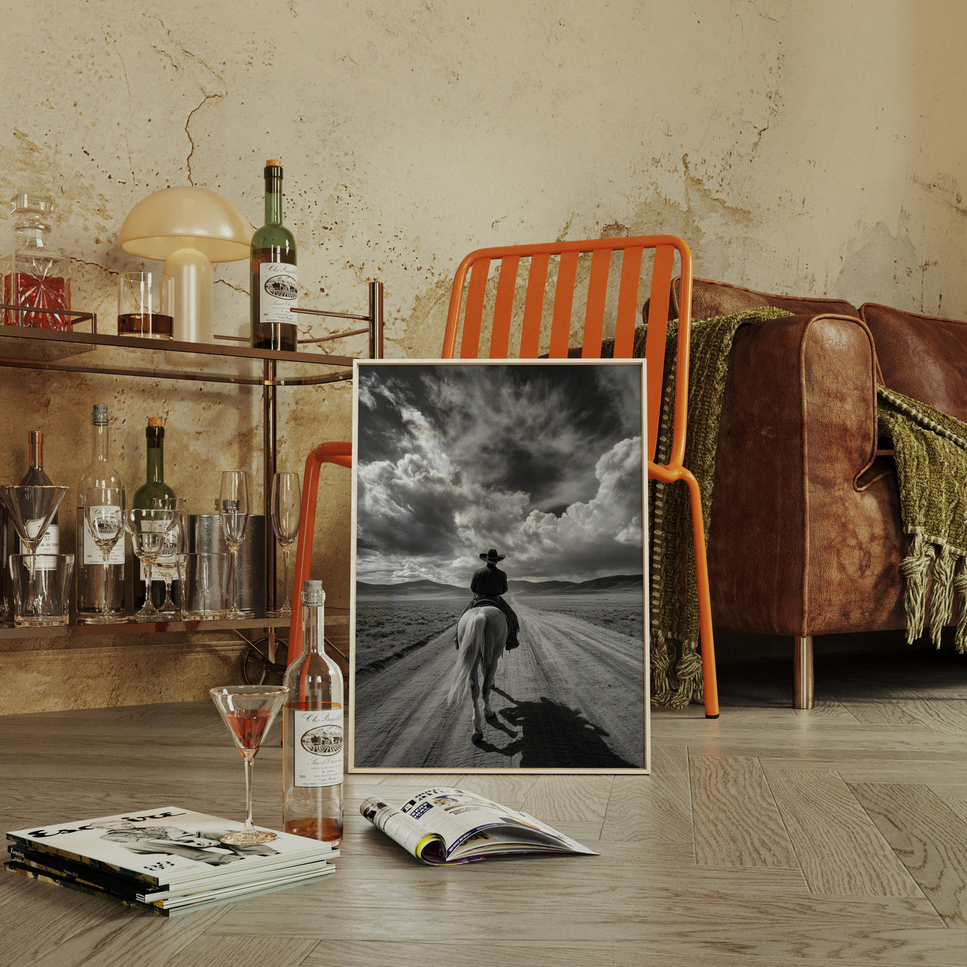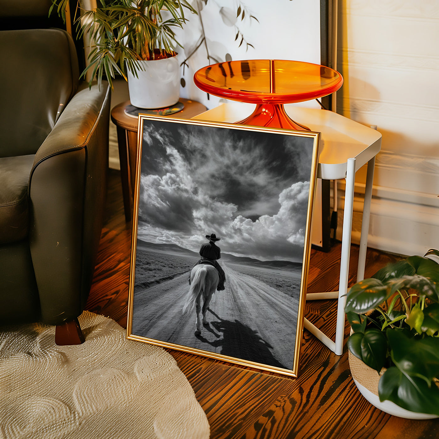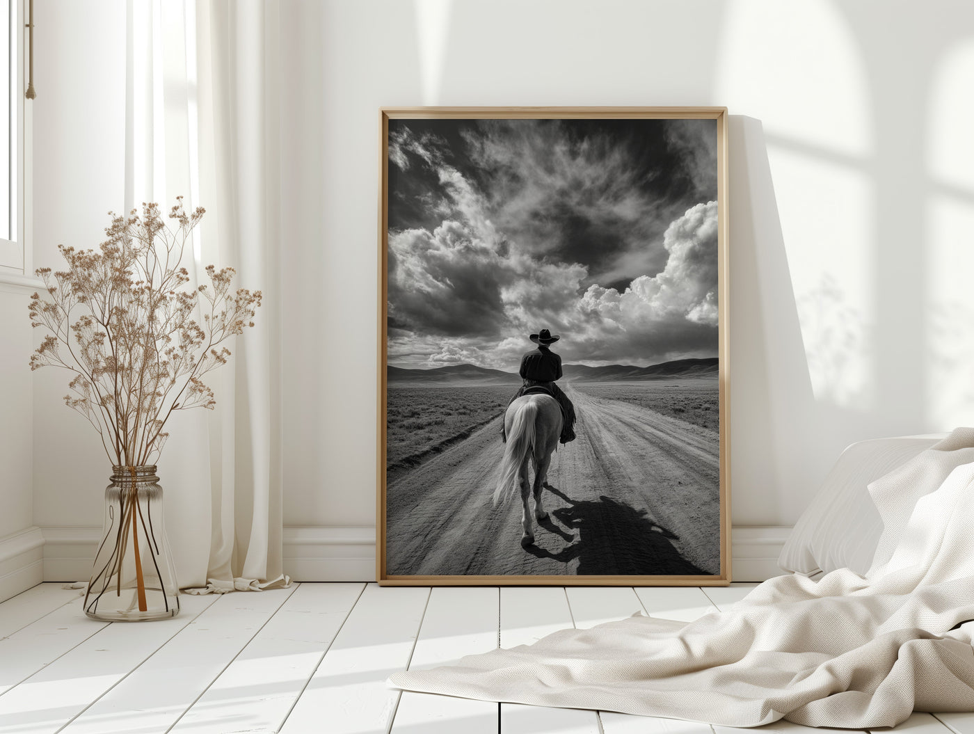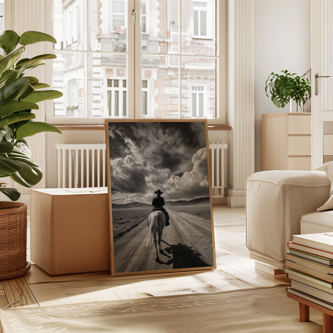 Part of our Against All Odds collection, this stirring photograph captures the essence of determination in its purest form. The lone rider facing the dramatic storm clouds creates a powerful metaphor for life's challenges, while the endless dirt road represents the journey we all must take through uncertain times. The cinematic composition transforms a moment into a timeless story about courage, resilience, and the quiet heroism found in simply moving forward when everything tells you to stop.