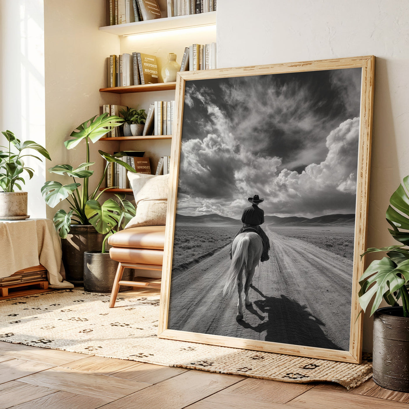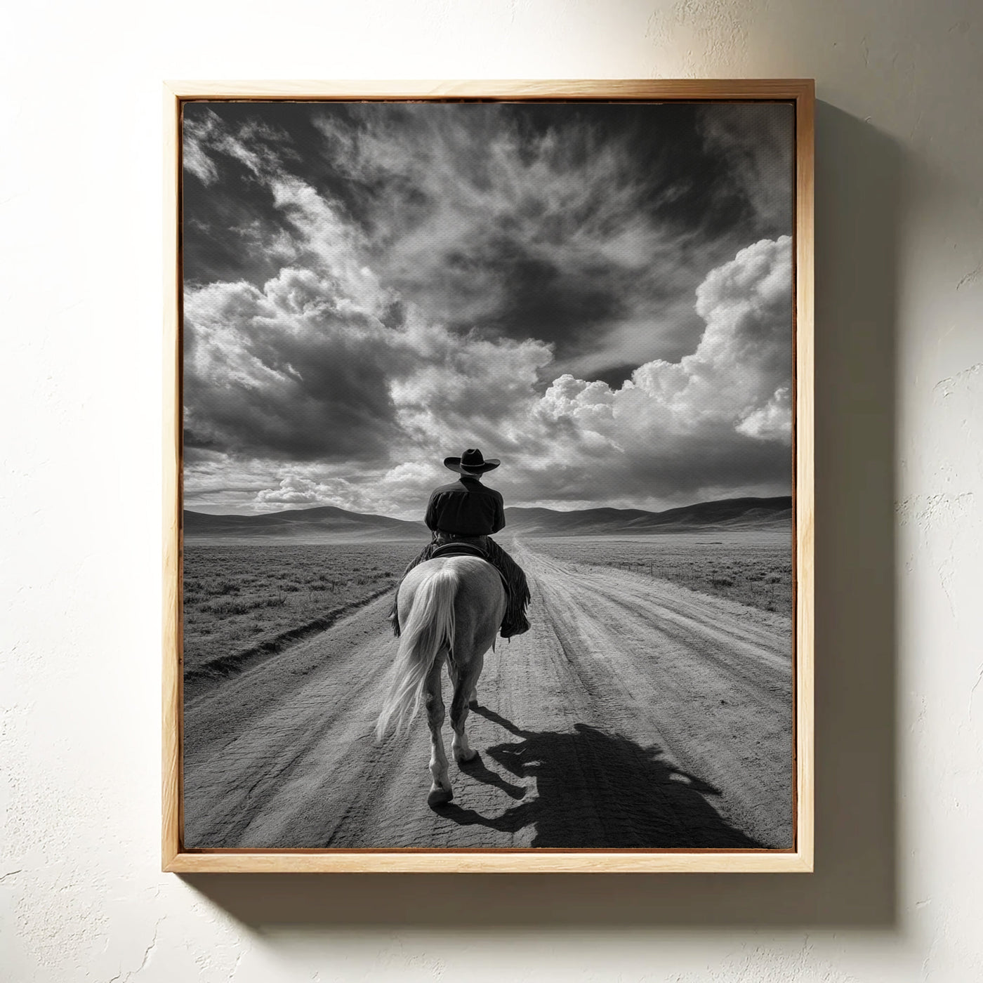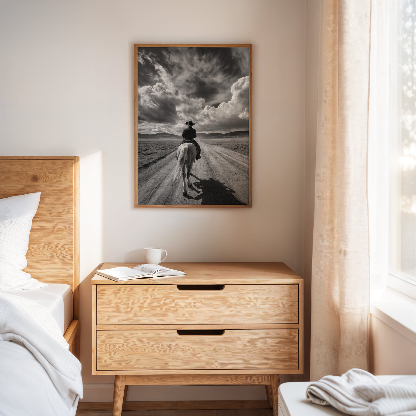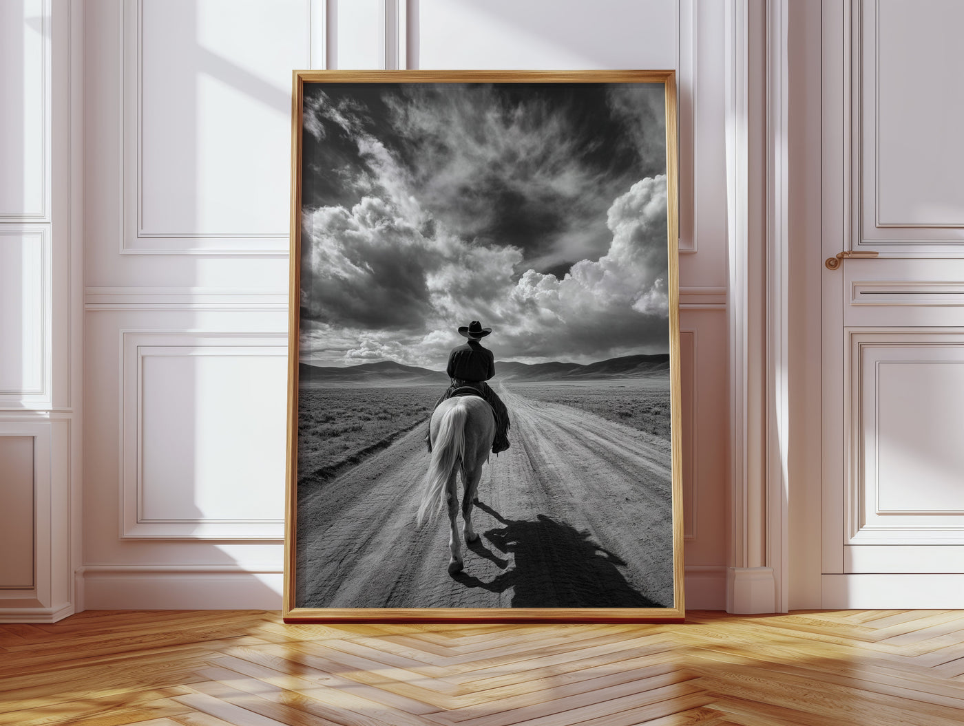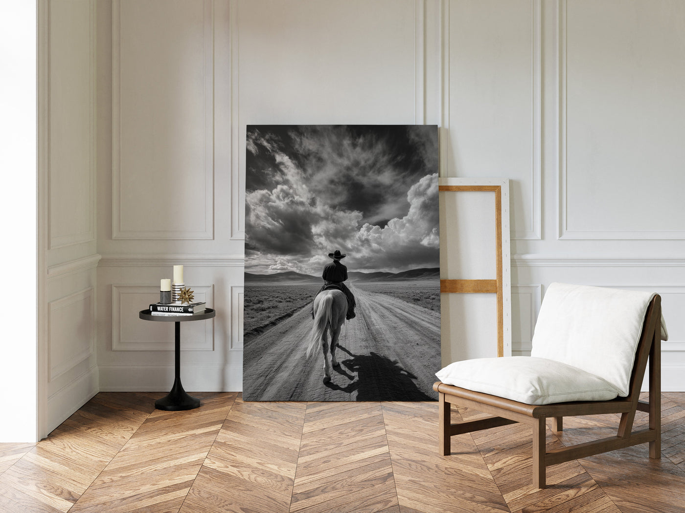 Part of our Against All Odds collection, this stirring photograph captures the essence of determination in its purest form. The lone rider facing the dramatic storm clouds creates a powerful metaphor for life's challenges, while the endless dirt road represents the journey we all must take through uncertain times. The cinematic composition transforms a moment into a timeless story about courage, resilience, and the quiet heroism found in simply moving forward when everything tells you to stop.