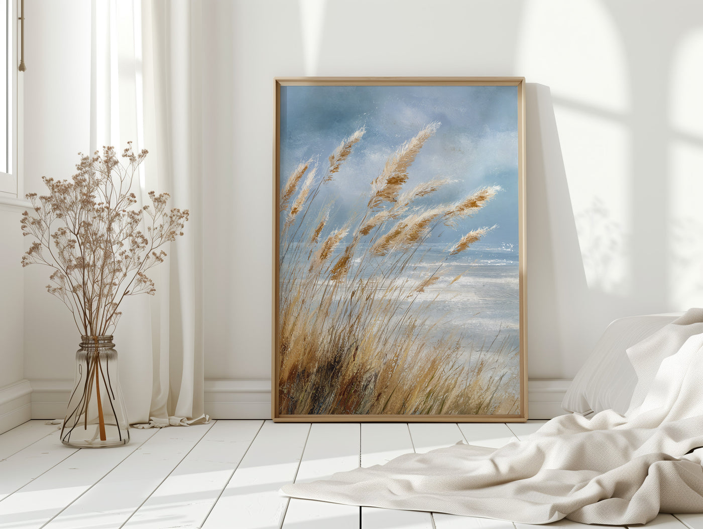 In a world that often rushes by, let the gentle sway of coastal grasses transport you to a place of calm and tranquility. This artwork captures the essence of a serene shoreline, where every breeze whispers tales of the sea.