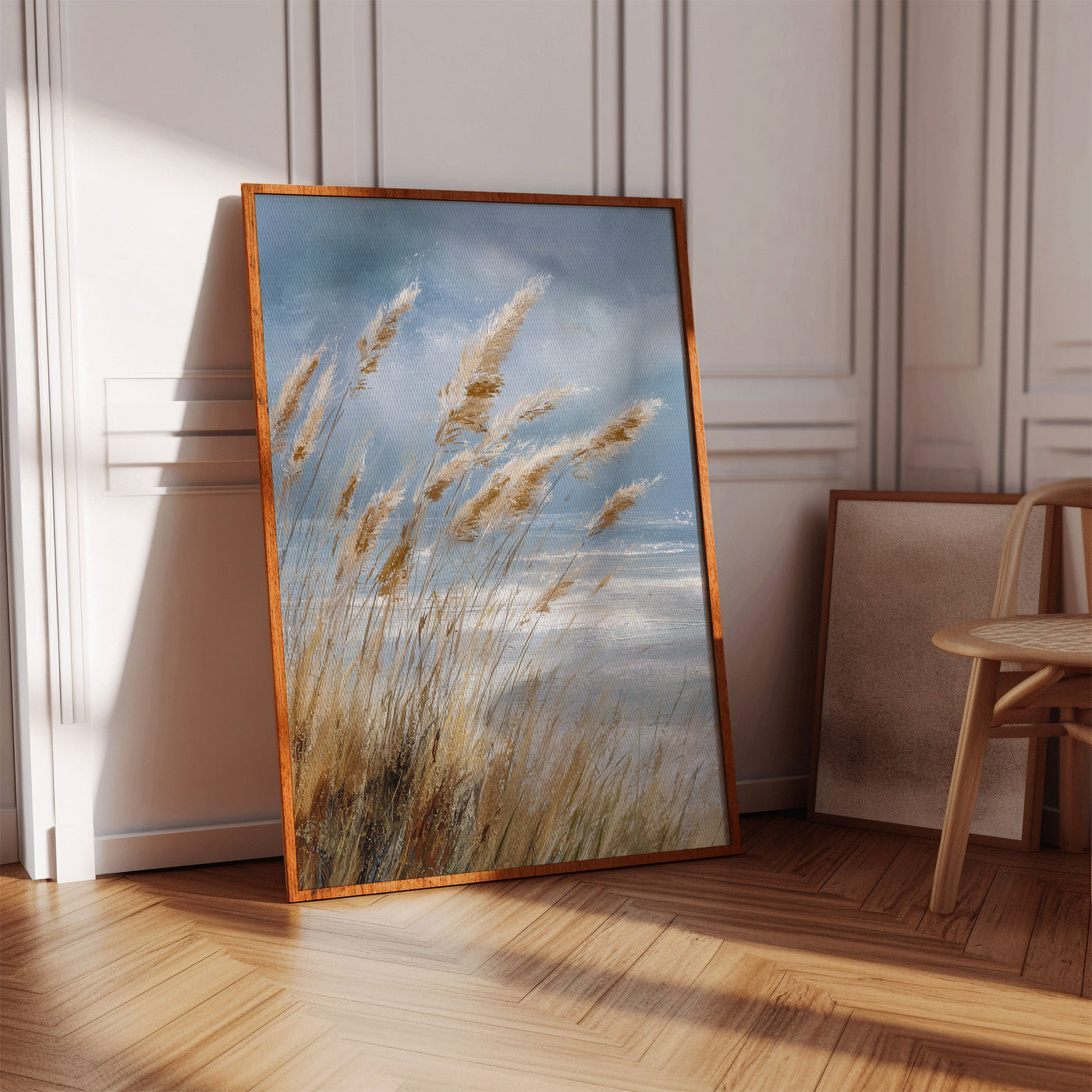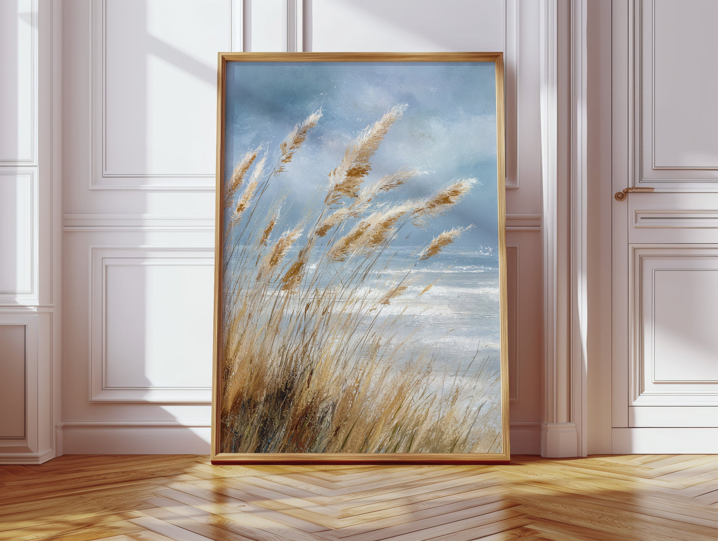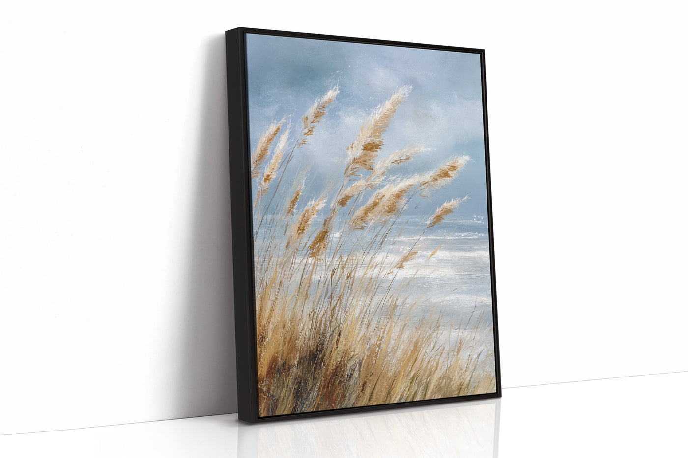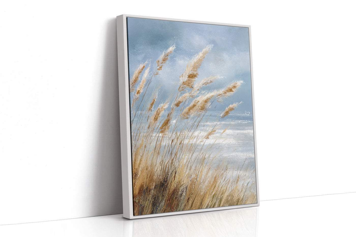Inspired by the natural beauty of windswept coastlines, this piece embraces the fluidity and grace of nature. The artist's keen eye for detail brings to life the soft, golden hues of the grasses against a backdrop of a vast, open sky.