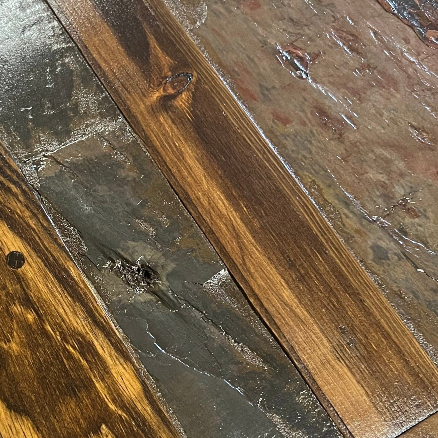 Our slate-top tables are made with natural slate stone combined with solid wood. Because slate is a natural material, each table will feature unique variations in color, texture, and surface patterns. You may also notice slight differences in height between the slate and the surrounding wood.